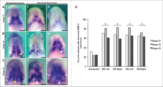 Figure 9. BMP-4 expression is reduced and incorrectly localized in response to altering HCN4 expression. (A) At NF stage 27 BMP-4 is expressed in 2 bilateral patches around the developing heart field (i). Altering HCN4 caused a loss of definition to the fields (ii) as well as an overall reduction in the size of the fields and intensity of expression (iii). (B) BMP-4 remains bilaterally expressed during heart looping (NF stage 32) with an additional asymmetric area of expression in the myocardium (yellow arrow, i). This left-sided myocardial expression helps to direct and orient heart looping. Overexpression of HCN4 and expression of HCN4-DN(AAA) not only disrupted the lateral BMP-4 fields of expression (ii), it also caused both a randomization and loss of myocardial expression (white arrow, iii). (C) By the end of looping at NF stage 35, BMP-4 is evenly expressed in the myocardium and retains its bilateral expression in the surrounding tissues (i). Similar to stage 27 and 32, disruption of HCN4 led to both a reduction in expression as well as a loss of field definition (ii, iii). Injected embryos frequently displayed malformed hearts who did not complete looping properly (yellow vs. white arrows). All abnormal images are from HCN4-DN(AAA) injected embryos but similar phenotypes were observed with HCN4-OE embryos. (A-C) Images are ventral views with anterior at top. (D) All stages and injection conditions induced significantly higher percentages of abnormal phenotypes compared with controls (Stage 27: Ï2 = 32.4768, df = 4; Stage 32: Ï2 = 82.2366, df = 4; Stage 35: Ï2 = 36.0791, df = 4; All: *p < 0.05). There was no statistical difference between overexpression and dominant-negative phenotypes. n = 58â79 embryos per condition across 3 biological replicates. OE = HCN4-OE, DN = HCN4-DN(AAA). Scale bars = 200 μm. |