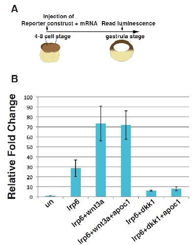 Fig. S4. Apoc1 does not cooperates with extracellular Wnt components to modulates Wnt signaling in TOPFlash assay. (A) Schematic drawing of the experiment. (B) 300 pg of lrp6 mRNA and either 20 pg of wnt3a or 50 pg dkk1 with or without 500 pg of apoc1 mRNA were co-injected with 100 pg of 14XTOPFlash and 25 pg Renilla reporter DNA into 4 to 8cell-stage Xenuous embryos. Firefly and Renilla luciferase were measured at st.10. |