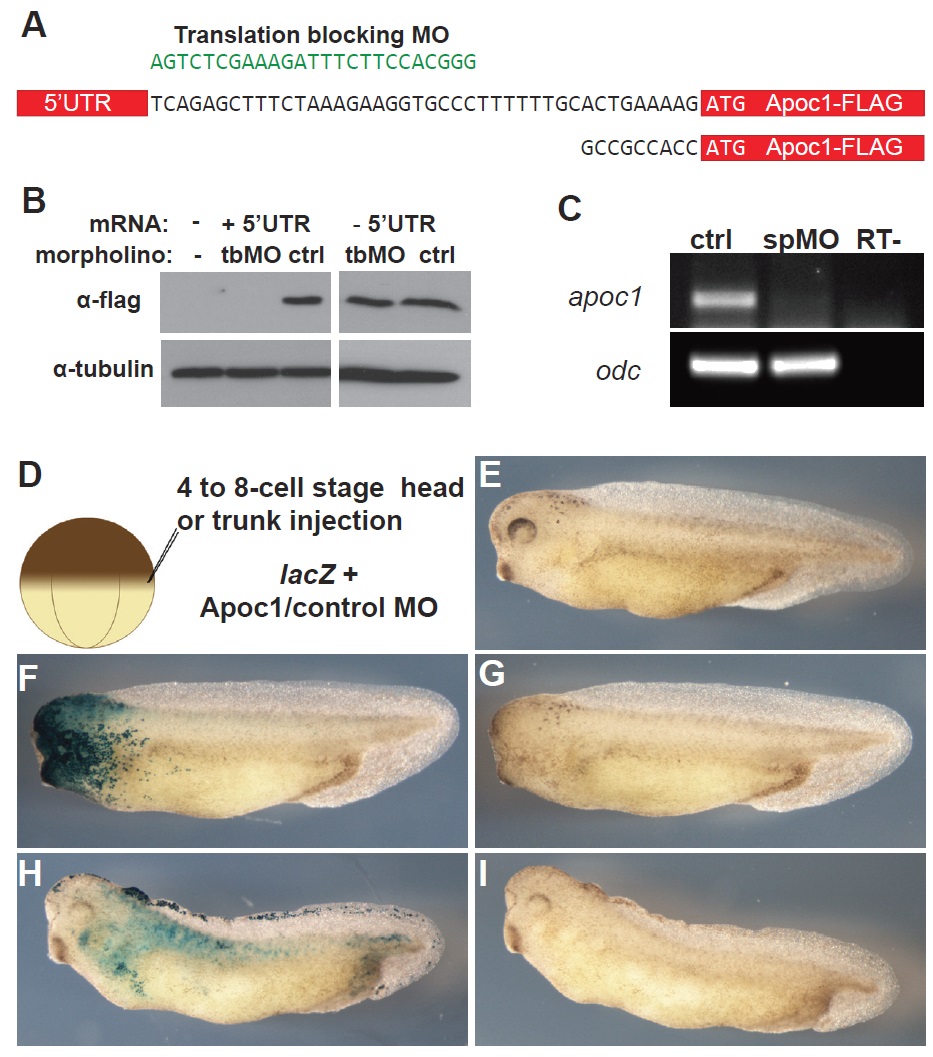Fig. 3. Loss of neural crest derivatives in Apoc1 depleted embryos. (A) The Apoc1 translational blocking MO (tbMO) targets the 5â UTR region of the Xenopus laevis apoc1 gene. To determine the efficiency of the tbMO, two flag-tagged apoc1 constructs were used differing only in the region upstream of the ATG start site. (B) Western blot using an anti-flag antibody on lysates from embryos injected with 300 pg 5âUTR-apoc1-flag or apoc1-flag mRNA and 40 ng Apoc1 tbMO or 40 ng control MO (ctrl). (C) 30 ng of the splice blocking morpholino (spMO) or control MO (ctrl) was injected into the animal side of two blastomeres at the two-cell stage and the embryos were assayed by RT-PCR at stage 10.5. Odc is used as loading control. (D) Schematic drawing of the experiment. 40 ng Apoc1 MO was injected into either the presumptive head (F,G) or trunk/tail (H,I) region together with 200 pg lacZ mRNA. (E) Embryos injected with 40 ng control MO were normal. (F,G) Injections targeted to the head region resulted in 76.1% (n=134) of the embryos displaying small or missing eyes and head deformation. (H,I) Injections targeted to the trunk region resulted in perturbed dorsal fin development in 55.2% (n=38) of the embryos. The pictures in (G,I) were taken prior to X-gal staining (F,H). |