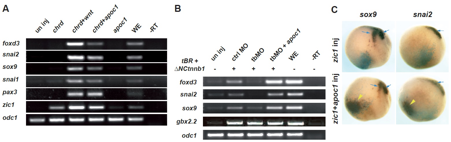 Fig. 5. Apoc1 can substitute for wnt in the animal cap neural crest induction assay. (A) 200 pg of chrd, 200 pg wnt3a and/or 300 pg of apoc1 was injected into two animal blastomeres of 4- or 8-cell stage embryos. Animal caps were dissected at stage 9 and cultured until stage 19. Gene expression was assayed by RT-PCR. (B) 125 pg tBR (dominant negative form of bmpr1a) and 30 pg aN-HA-Ctnnb1 (constitutively active form of ctnnb1) mRNA was injected in two animal blastomeres at the 4- to 8-cell stage to induce neural crest cell marker expression. In addition, 40 ng of either control (ctrl) or translation blocking Apoc1 MO (tbMO) with or without 400 pg MO-resistant apoc1 mRNA was injected to determine if Apoc1 is required for neural crest induction. Animal caps were dissected at stage 9 and cultured until stage 16. Gene expression was assayed by RT-PCR. (C) Coinjection of apoc1 and zic1 into the ventral side of the embryo induced ectopic expression of sox9 and snai2. 50 pg of zic1 +/- 500 pg of apoc1 was injected into ventral marginal cells of 8 cell-stage embryos. The embryos were fixed at stage 14, and subjected to whole mount in situ hybridization. The blue arrows point to endogenous sox9 and snai2 expression. The yellow arrowheads show the area of ectopic sox9 and snai2 expression. |
