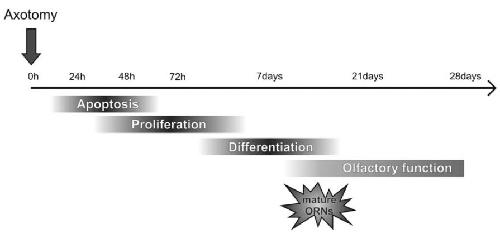 axotomy of the olfactory nerves is summarized in a timeline. The points on the timeline represent