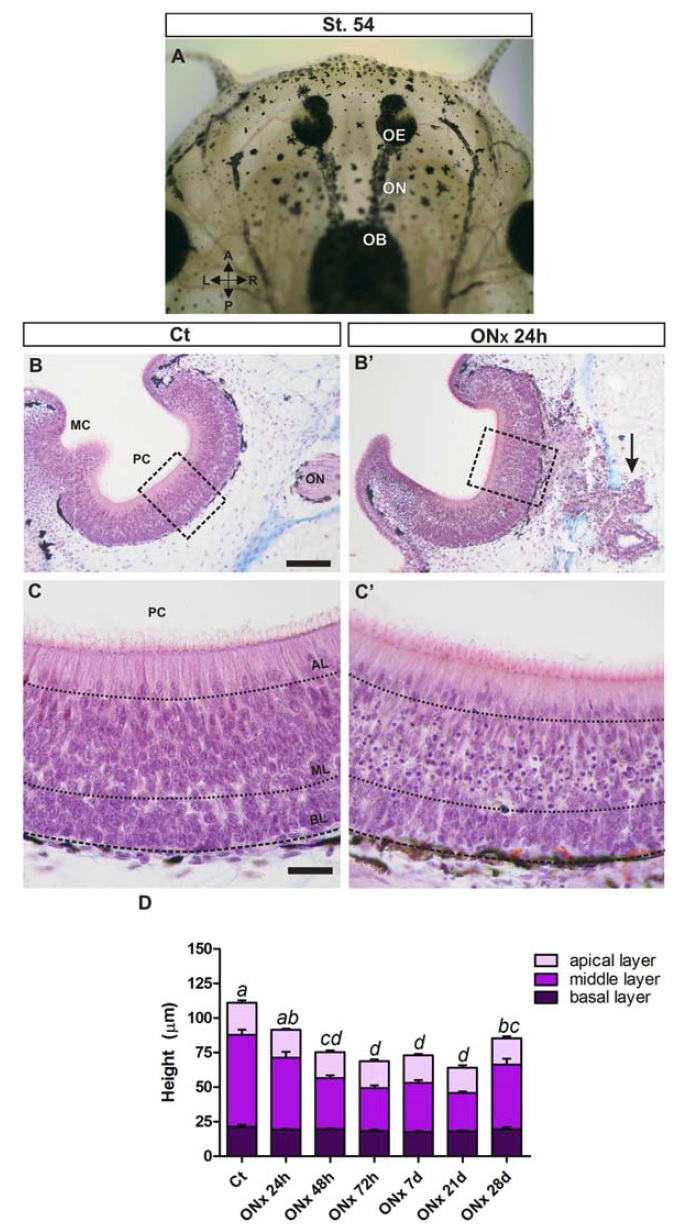 X. laevis larvae (Stage 54), OE, olfactory nerve (ON), olfactory