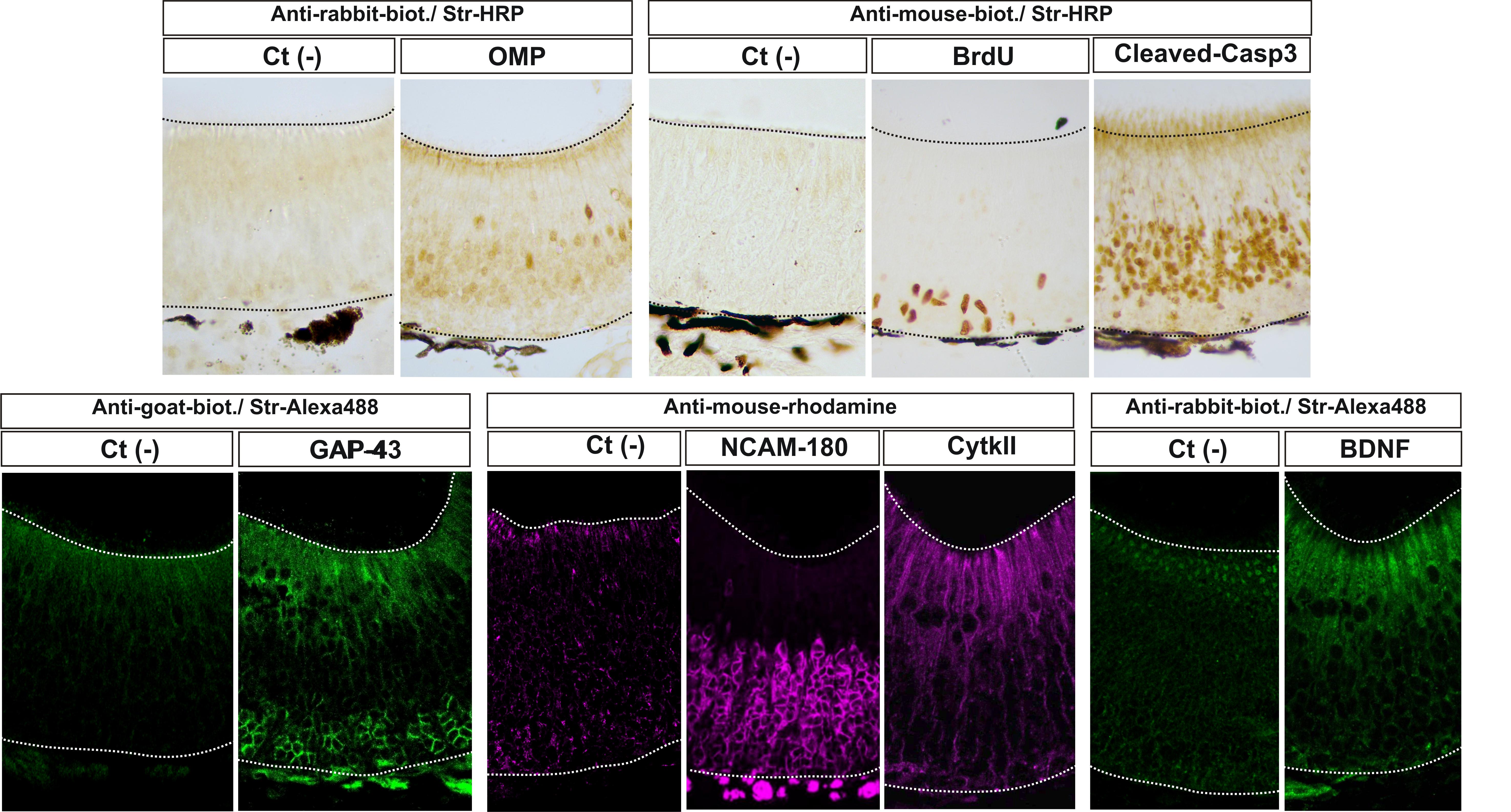 Fig. S1. Negative controls for immunohistochemistry and immunofluorescence by omitting primary antibodies. Primary antibodies were omitted (Ct(-)) and no specific immunostaining is visible after incubation with the secondary antibodies biotinylated (biot.) coupled with streptavidin- horseradish peroxidase (Str- HRP) or coupled with a fluorophore (rhodamine or Alexa 488). |
