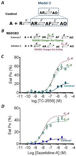 Fig 5. Model-2.A. Linear Model of receptor activation incorporating an intermediate flip state (AF) between ligand bound (AR) and open (AO) states. Dotted box suggests that the gating step from Fig 4 is extended to include flipping step in this model. B. Proposed schemes represent when NS9283 changes the pre-activation (F) or gating (E) constants. The equilibrium constants were estimated using Scheme 2. All equilibrium constants are defined as previously, and F is equal to the forward rate/reverse rate. C TC-2559 and D Saz-A data plotted (mean ± s.e.m.) is same as Fig 4, while the dotted curves represent predicted open-probability curves from Models 2 where either the pre-activation constant (F green) or the gating constant (E red) were multiplied by the constant CF or CE respectively.