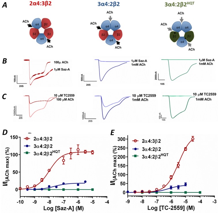 Fig 1. Saz-A and TC-2559 act selectively at the α4-β2 interface.A Schematic showing α4-β2 (black arrow) and α-α (grey arrow) binding sites for ACh at the 3α4:2β2, 2α4:3β2 and 3α4:2β2HQT receptors. B. Current traces of Saz-A (1μM) and C. TC-2559 (10μM) for 3α4:2β2, 2α4:3β2 and 3α4:2β2HQT receptor compared to maximum ACh currents on the same oocyte. Peak currents elicited by D Saz-A and E TC-2559 were normalized to the saturating concentration of ACh and fitted to non-linear curve fits. The injection ratios of α4:β2 that correspond to the 3α4:2β2 (blue) and the 2α4:3β2 (red) receptors are 4:1 and 1:4 respectively. Saz-A and TC-2559 do not activate the 3α4:2β2HQT (green) receptor that has three α4-α4-like interfaces. Dots represent the mean ± s.e.m.