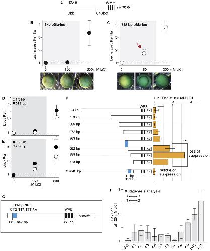 (H) Mutagenesis analysis of the 11-bp NRE. Data are mean luciferase/renilla signal ± SEM from two to four biological replicates.
