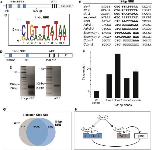 (H) Our findings suggest that signal in the Wnt pathway does not only activate target genes through WRE, but also tunes expression of the gene through a suppressive 11-bp NRE. Further, our findings also suggest that β-catenin mediates this coupling.