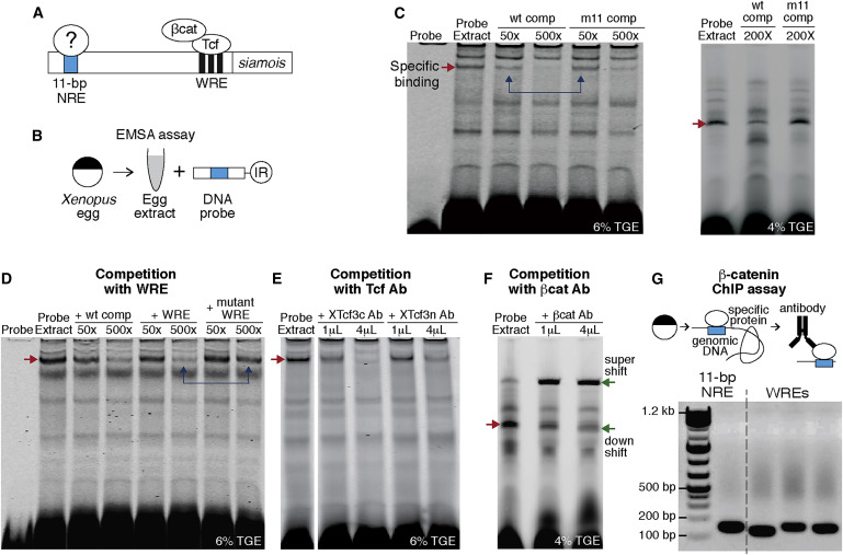 (A) The three 11-bp NREs in siamois promoter compete with WRE. WRE probe without competition (lane 1) and with 200x unlabeled 11-bp NRE (lane 2) and the 2 elements similar to the 11-bp NRE (lanes 3 and 4). (B-C) EMSA assays of predicted 11-bp NREs in promoters of siamois, engrailed, Xnr3 (B) T, Axin2, and Cdx4 (C). Red arrow: specific binding to the 11-bp NRE.