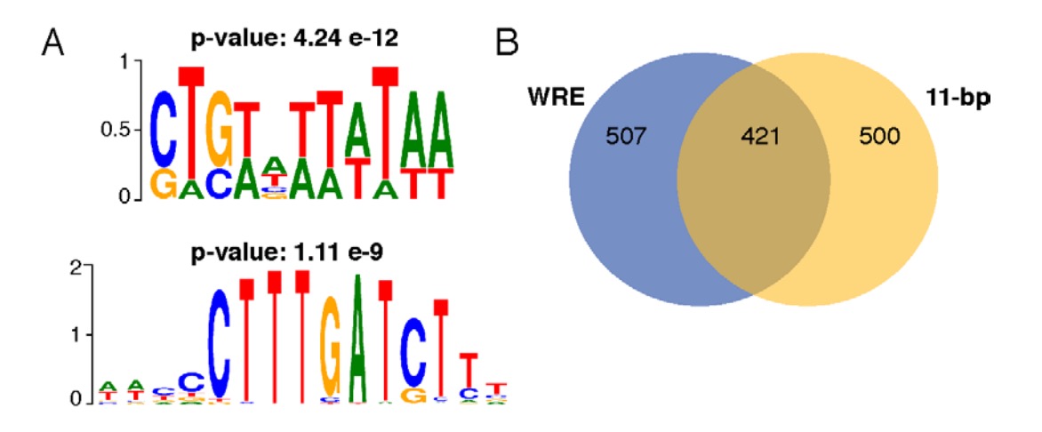 (A) The 11-bp NRE motif is significantly enriched in 600-bp peaks of β-catenin Chipseq on HCT-116 cells. As a positive control, significant enrichment was also found for the WRE motif. (B) Co-enrichment analysis. Out of the 2624 total 600-bp peaks from the β-catenin Chipseq, 1428 contain the 11-bp NRE and/or WRE motifs. Out of these 1428 peaks, 421 contain both motifs.