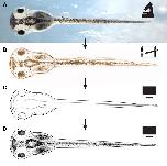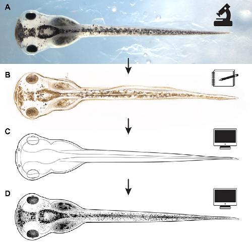 Fig. 2. Evolution from the view through the microscope to the final digital image. Anterior is towards the left in all images. (A) The micrograph of one of the Xenopus embryos used by Zahn to draw preliminary sketches of the dorsal view of a stage 43 tadpole. (B) Zahn's preliminary sketch of a stage 43 tadpole, dorsal view, based on visual examination of two or three examples, including that shown in A. (C) Vector drawing made in Adobe Illustrator based on the sketch and the micrographs. (D) Final drawings include shading added using Adobe Photoshop. |