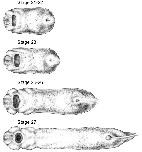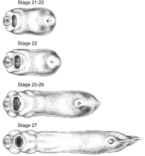 Fig. 5. Ventral views of 4 stages of Xenopus development. Anterior is towards the left. Drawings by Natalya Zahn licensed under CC-BY-NC at http://ase.tufts.edu/biology/faculty/adams/zahnDrawings.htm and reproduced with permission. |