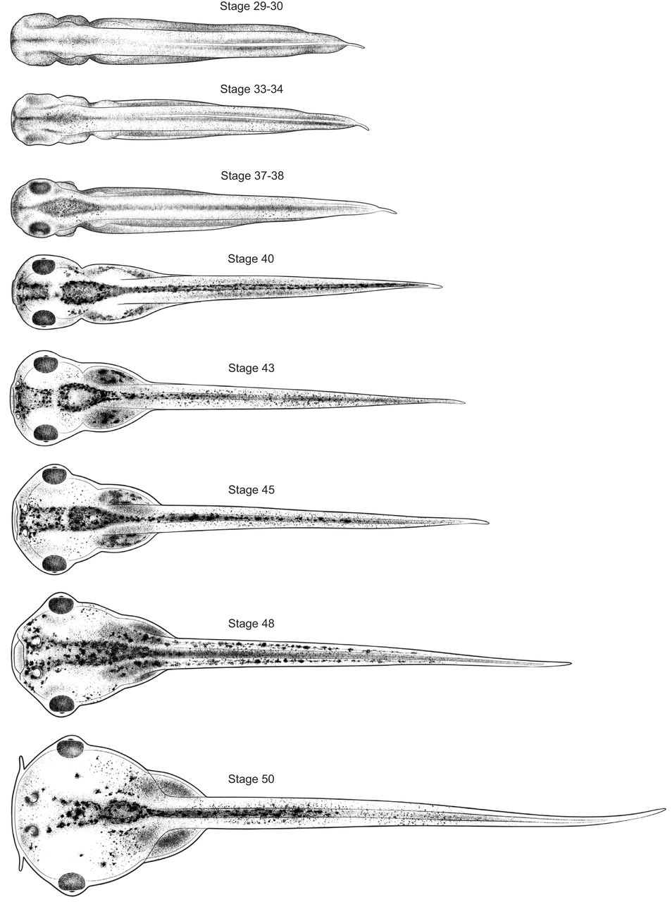 Fig. 4. Dorsal views of 8 stages of Xenopus development. Anterior is towards the left. Stage 48 is shown with mouth open. Drawings by Natalya Zahn licensed under CC-BY-NC at http://ase.tufts.edu/biology/faculty/adams/zahnDrawings.htm and reproduced with permission. |