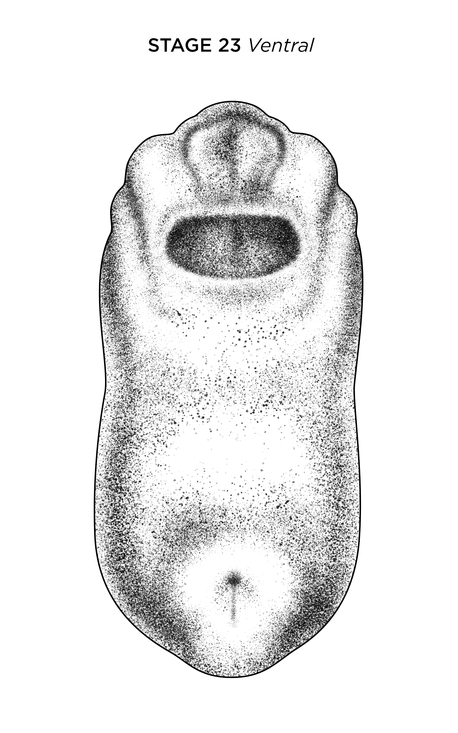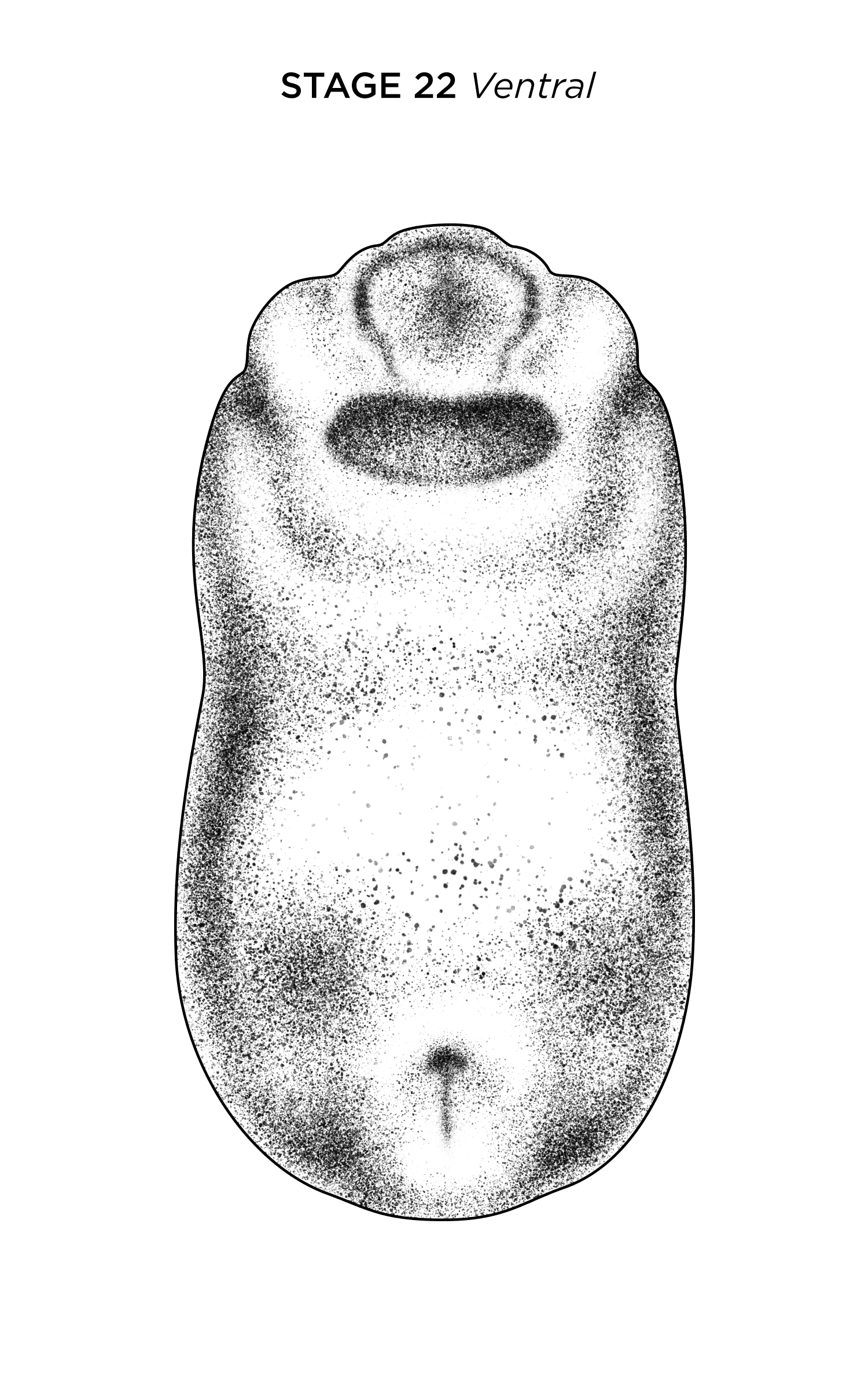 Xenopus laevis embryo at NF stage 22, ventral view, anterior up. Scale bar= 1mm. Illustration © 2017 Natalya Zahn, CC BY-NC 4.0.