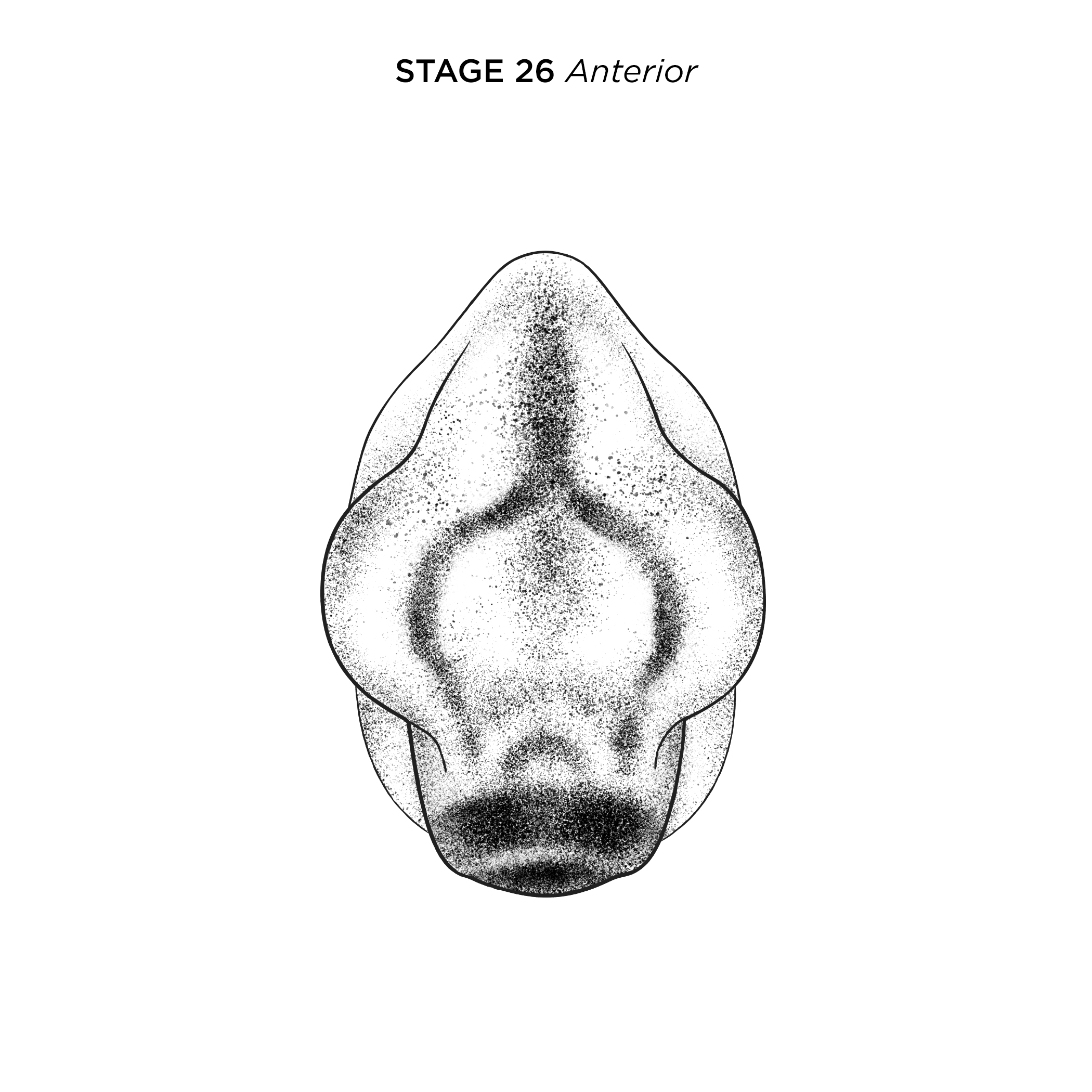 Xenopus laevis embryo at NF stage 26, anterior view, dorsal up. Scale bar= 1mm. Illustration © 2021 Natalya Zahn, CC BY-NC 4.0. |