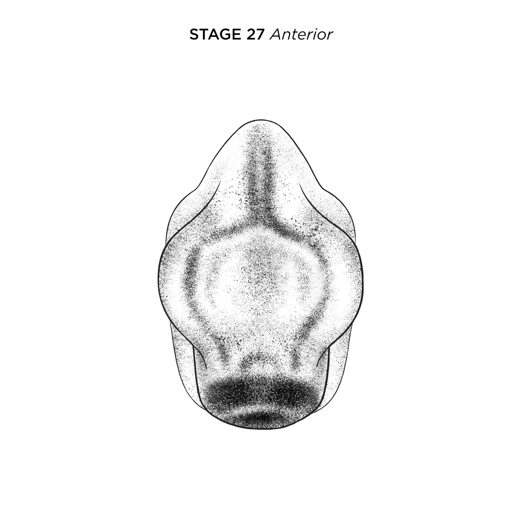 Xenopus laevis embryo at NF stage 27, anterior view, dorsal up. Scale bar= 1mm. Illustration © 2021 Natalya Zahn, CC BY-NC 4.0. |