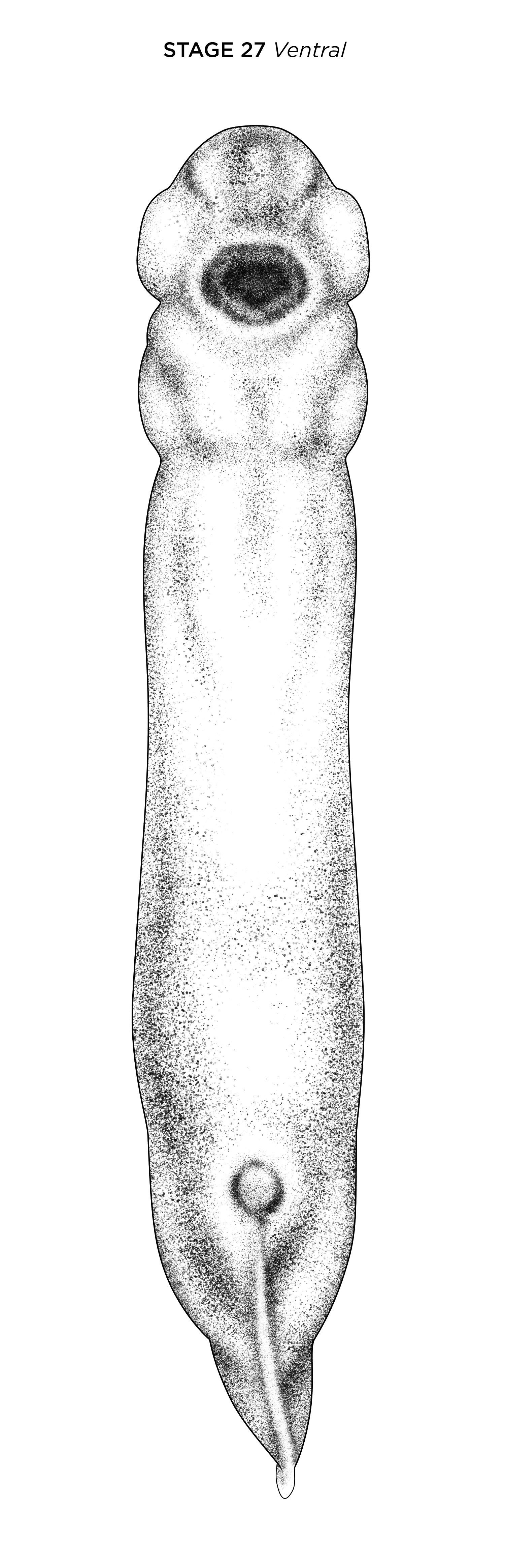 Xenopus laevis embryo at NF stage 27, ventral view, anterior up. Scale bar= 1mm. Illustration © 2021 Natalya Zahn, CC BY-NC 4.0. |