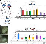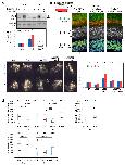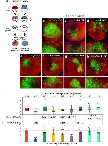Supplementary Figure 7 | Dispersion assay. (a) Diagram of the assay. A clone of experimentally manipulated cells was produced within the BCR by injection of a single blastomere at the 32-cell stage. The distribution of the labelled progeny was determined at the early gastrula stage when endogenous separation occurs. (b-h) Representative examples. Live fluorescence images. Nuclei were stained with Hoechst, pseudocolored in red. Lower panels are enlargements of part of the main image. (i) Quantification of dispersion using Delaunay triangulation and represented as a Tukey boxplot. Comparisons to mesoderm (red) and to ephrin expression (purple) were done using one-sided Studentâs t-test. Numbers above, total number of BCRs. (j) Quantification of the relative heterotypic contact length. (b) When the clone was induced to a mesodermal fate, cells formed a tight cluster sharply delineated from the surrounding ectodermal BCR. (c) When the entire BCR was induced to mesoderm, the labelled clone was broadly dispersed. (d-h) Manipulation of a clone within an IMBCR. (d) C-cadherin overexpression had no effect. (e,f) caRho expression impaired dispersion (e), but a similar effect was observed when caRho was expressed throughout the IMBCR (f), indicating that the effect was not related to a difference in tension between the clone and the surrounding cells, but most likely to interference with intercellular migration. (g) Clones of ephrinB1/B3-expressing mesoderm cells remained confined in a compact area of the IMBCR. Note that control expression of the same ephrins throughout the entire IMBCR led to normal dispersion, demonstrating that, unlike caRho, ephrin expression did not impair intercellular migration, but generated a genuine process of cell sorting (i,j). (h) Replacement of C-cadherin with E- or N-cadherin had no effect. Scale bar, 200μm. |