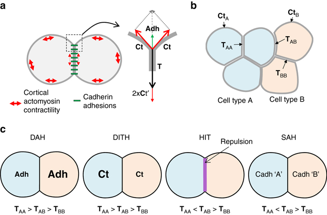 Fig. 1. Contact tension and cell sorting. a Diagram of two adhering cells and representation of the force equilibrium at a contact vertex. The cadherin adhesive structures are represented in green, and the contractility of the actomyosin cell cortex by red double arrows. Note that cadherin adhesions influence the cell cortex, decreasing tension along contacts (smaller double arrows). The equilibrium of forces at a vertex involves the cortical tension Ct at the free surface of each cell and the contact tension T between the two cells. T is the sum of the two cortical tensions at the contact (Ct′) and of cell–cell adhesion (Adh), which acts in the opposite direction to expand the contact. b Contact tensions in tissues. T AA and T BB represent tensions at homotypic contacts. T AB represents the contact tension at heterotypic contacts, also called here interfacial tension. c Comparison of the four models for cell sorting and separation based on contact tensions. In the differential adhesion hypothesis (DAH) and the differential interfacial tension hypothesis (DITH), the two cell populations have different homotypic tensions, and the heterotypic tension is intermediate. Repulsive mechanisms such as those generated by ephrin-Eph signalling generate high interfacial tension (HIT). The same situation can be achieved in the selective adhesion hypothesis (SAH), due to preferential homotypic cadherin interactions |