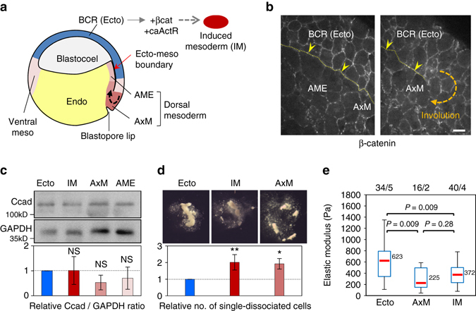 Fig. 2. Xenopus ectoderm and mesoderm and their adhesive and contractile properties. a Diagram of the early Xenopus gastrula indicating the regions used as the source for tissue explants. Induced mesoderm was produced by expression of β-catenin (β-cat) and constitutively active Activin receptor (caActR) in the blastocoel roof (BCR). b Distribution of adhesive structures in the ectoderm blastocoel roof (BCR or Ecto), anterior mesendoderm (AME) and axial mesoderm (AxM) visualised by β-catenin immunostaining. The thin yellow dotted line and yellow arrowheads point to the mature (left panel) or nascent (right panel) ectodermâmesoderm boundary. Scale bar, 20âµm. See also Supplementary Fig. 1b (câe). Characterisation of adhesive and contractile properties. c Total cadherin levels in dissected tissues determined by immunoblot and expressed as the relative ratio to GAPDH. Graph shows mean values from seven independent experiments. Error bars, s.d. NS: not significantly different from ectoderm, based on one-sided Studentâs t-test. d Resistance to dissociation, measured as the number of single-dissociated cells, normalised as the ratio to ectoderm. Mean of four independent experiments. Individual comparisons were made using one-sided Studentâs t-test. *Pâ<â0.05; **Pâ<â0.01. Error bars, s.d. e Cortical tension. The elastic modulus of single cells was determined using AFM. The box plots show the interquartile range (box limits), median (centre line and corresponding value), and min and max values without outliers (whiskers). Number of cells/experiments are indicated on top. Individual comparisons were done using Tukeyâs HSD test after a significant one-way ANOVA (Pâ=â5.7eâ08) |