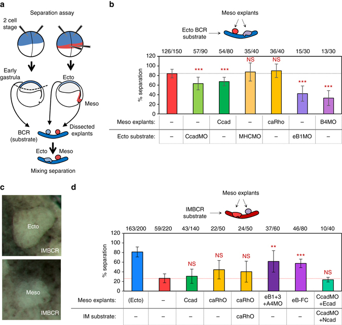 Fig. 4. Impact of adhesive and contractile difference on ectodermâmesoderm separation. a Scheme of the separation assay. Embryos injected at the 2 cell-stage were dissected at the early gastrula stage. Explants were laid on a BCR, and the number of explants remaining separated were scored. b Maintenance of ectodermâmesoderm separation. Cellâcell adhesion was levelled by C-cadherin depletion in the ectoderm (morpholino injection, CcadMO), or overexpression in the mesoderm (mRNA injection, Ccad). Differences in contractility were levelled by depletion of MHC2A and B in the ectoderm (MHCMO) or by expression of constitutively active RhoA (mRNA injection, caRho) in the mesoderm. Ephrin-Eph signalling was inhibited by depletion of ephrinB1 (eB1MO) or EphA4 (A4MO), respectively, in the ectoderm or the mesoderm. c Example of the assay using a blastocoel roof induced to mesoderm as substrate (IMBCR). Ectoderm explants remain separated, whereas mesoderm explants sink into the IMBCR. d Induction of separation between mesoderm explants and IMBCR. Differences in cellâcell adhesion were imposed by C-cadherin overexpression (Ccad) and differences in contractility by expression of caRho. Ephrin-Eph signalling was stimulated by expression of ephrinB1 and B3 and simultaneous depletion of EphA4. Alternatively, signalling was activated at the surface of the mesoderm explants using preclustered ephrinB3-Fc soluble fragments (eB-Fc). Differences in cadherin expression were created by C-cadherin depletion (CcadMO) and its replacement with E-cadherin on one side and with N-cadherin on the other side. Ectoderm explants were used as a positive control (blue column). In an additional control, myosin activity was increased in both explant and substrate (caRho). The numbers on top corresponds to the number of explants that remained separated/total explants (10 explants per independent replicate). Graphs show mean values, error bars s.d. Individual comparisons to control mesoderm (red asterisks) were done using one-sided Studentâs t-test |