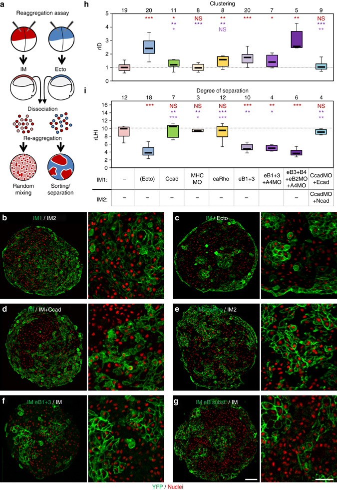 Fig. 5. Requirements for cell sorting from mixed aggregates. a Diagram of the assay: mixed aggregates composed of unlabelled cells and mGFP-expressing cells were fixed and cryosectioned. GFP-expressing cells were detected with an anti-GFP antibody (green) and nuclei were counterstained with Hoechst (red). bâg Representative examples, with detailed views in right panels. b Aggregates of unlabelled and labelled IM cells, which distributed randomly. c Positive control: GFP-labelled IM cells sorted efficiently from unlabelled ectoderm, forming sharply delimited groups. dâf Control IM cells were mixed with IM cells manipulated as follows: d C-cadherin overexpression; e expression of constitutively active RhoA; f EphrinB1+,3 expression; g substitution of mesodermal ephrinB2 and EphA4 (eB2MO and A4MO) with ectodermal ephrinB3 (eB3) and EphB4 (B4). Scale bars, main panel 200âµm, enlargement 100âµm. h Quantification of cell clustering, using a relative index of dispersion (rID). Clustering is defined as departure from a random distribution (index of 1). Box plot as above. The number of aggregates is indicated on top. One-sided MannâWhitney test was used for statistical comparison. Colour coded asterisks as follows: Red, comparison to control IM; dark and pale purple, comparison to ephrinB1â+â3 expression and to ephrin/Eph substitution (eB3â+âB4â+âeB2MOâ+âA4MO). Except for myosin depletion (MHCMO) and cadherin replacement (CcadMOâ+âEcad/Ncad), all manipulations led to some significant degree of clustering compared to control non-manipulated IM. Ephrins/Eph substitution led to the highest degree of clustering. i Quantification of the relative length of heterotypic interface (rLHI), defined as the ratio between the total length of heterotypic contacts and the theoretical minimal interface, calculated as the perimeter of a circle encompassing the total area of the labelled population (Supplementary Fig. 6). Conditions of ephrin ectopic expression alone or in combination with EphA4 depletion led to a significant shortening of rLHI. Separation was further improved by substitution of mesodermal with ectodermal ephrin/Eph. None of the other conditions significantly departed from the negative control aggregates of non-manipulated IM. Plot, statistical test and colour code as in h |