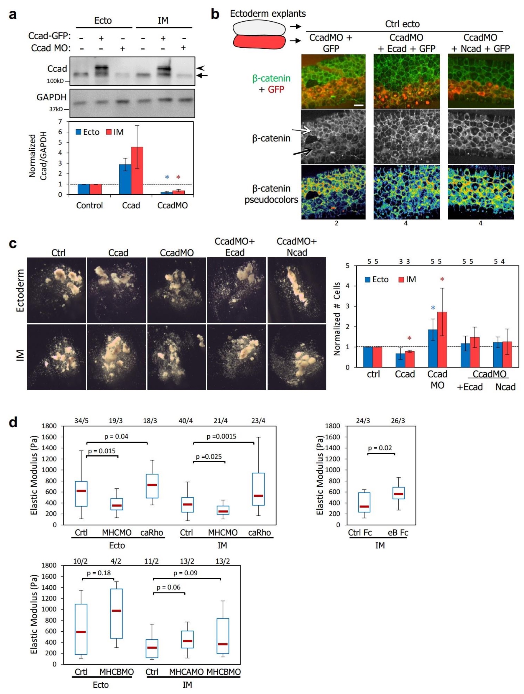 Supplementary Figure 2 | Experimental manipulation adhesion and actomyosin contractility. (a) Cadherin overexpression and depletion. Comparison by immunoblot of C-cadherin protein levels in control tissues and tissues from embryos injected with C-cadherin-GFP mRNA or C-Cadherin MO. Arrow, endogenous C-cadherin; arrowhead: Ccadherin-GFP. Quantification was performed from three independent experiments. Individual comparisons were done using Games-Howell test (* P<0.05) after a significant One-way Welch ANOVA (P<0.0001; unequal variances). Error bars are s.d. (b) Validation of cadherin depletion and replacement. C-cadherin was depleted by MO injection and replaced with E- or N-cadherin by co-injection of the corresponding mRNA. GFP mRNA was co-injected as a tracer. Manipulated ectoderm explants were juxtaposed to wild type non-injected ectoderm explants for direct comparison of β-catenin membrane immunostaining, used as a general marker for cadherin-based adhesive structures. Pseudocolors were added to help visualizing the decrease of β-catenin signal caused by CadMO and the rescue by expression of E- or N-cadherin. Numbers of samples indicated at the bottom. Scale bar, 30μm. (c) Effect of C-cadherin overexpression, depletion, and replacement on ectoderm and mesoderm cohesion. The same conditions as in (b) were tested for resistance to dissociation. Graph shows mean values and error bars are s.d. Number of experiments is given above the graph. Individual comparisons were done using Games-Howell test (* P<0.05) after a significant one-way Welch ANOVA P<0.0001; for unequal variances). (d) Manipulation of cortical contractility. Top left panel: Effect of MHC2A+B depletion (MHCMOs) and Rho activation (caRhoA mRNA) on the elastic modulus of ectoderm and induced mesoderm cells. Data are from 5 independent experiments. Right: Effect of Eph stimulation by soluble ephrinB3-Fc ligand. Lower left: Single myosin isoform depletion (MHC2A or MHC2B MO) did not cause a decrease in elastic modulus, suggesting that each isoform is able to compensate for the loss of the other. Box plots as in main Fig.2e. The number of cells tested/independent experiment is above the graph. Individual comparisons were done using Tukeyâs Hs.d test after a significant One-way ANOVA (P=5.7e-08). |