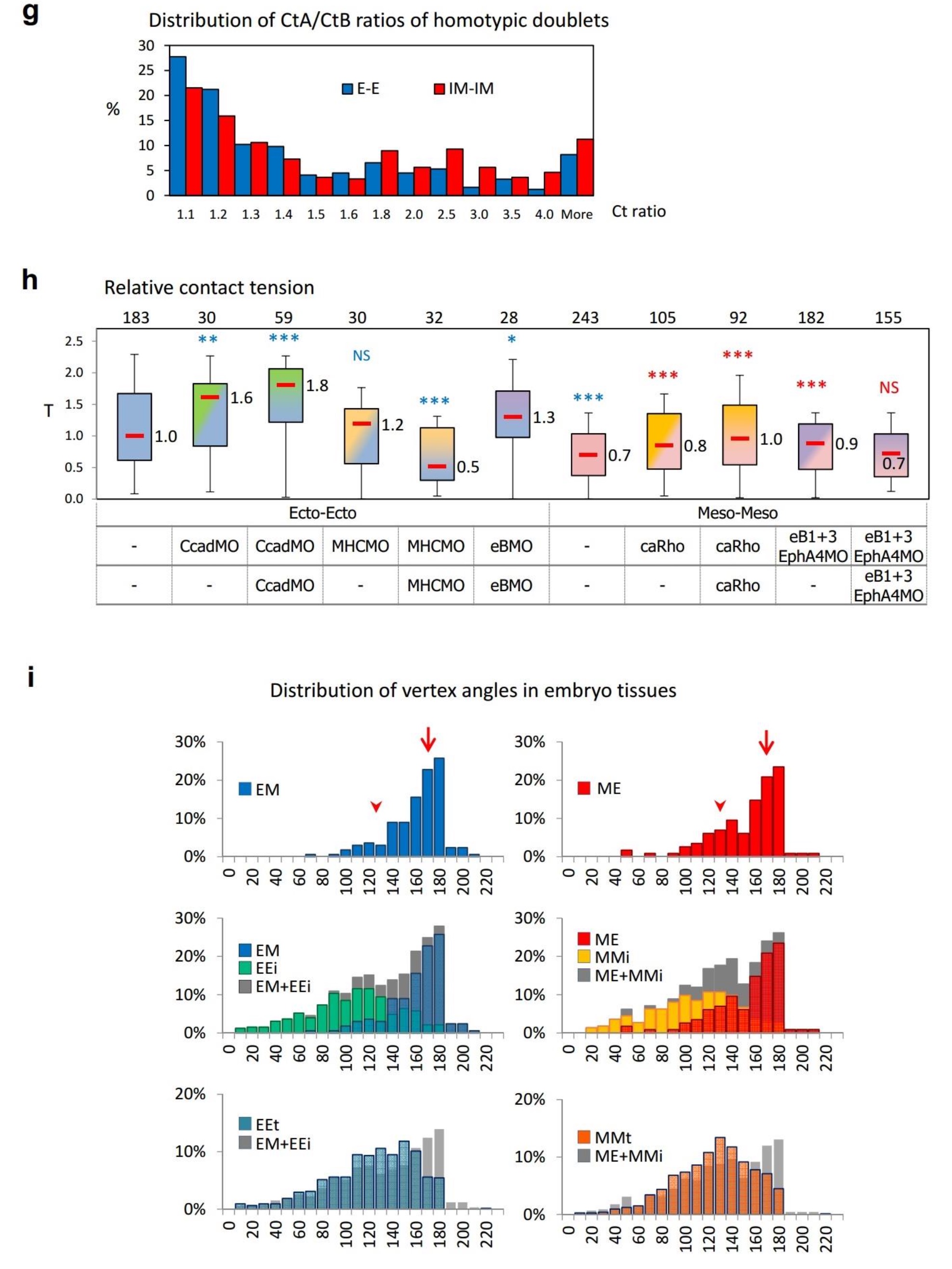 Fig. 3. Estimates of relative contact tensions. aâc Estimates based on the geometry of cell doublets. a Diagram of cell doublet, representing the balance between Ct A, Ct B and T Ab. Ï AB is the angle formed between Ct A and Ct B. The orange layer symbolises the actomyosin cortex. A curved cellâcell interface reflects unequal Ct A and Ct B tensions. b Examples of homotypic and heterotypic doublets, expressing membrane-targeted GFP or Cherry. Scale bar, 15âµm. c Relative T for different types of doublets, calculated based on measurements of angles at vertices and on the Ct values obtained by AFM (Fig. 2e) (detailed calculation in Supplementary Methods). E ectoderm, M mesoderm, IM induced mesoderm. Also shown combinations of IM doublets made of control (ctrl), cadherin-overexpressing (Cad) or cadherin-depleted cells (CcadMO). Box plot as above. The numbers on top of the graph are number of measured angles/number of experiments. Individual comparisons were done using one-sided Studentâs t-test. *Pâ<â0.05, **Pâ<â0.01, ***Pâ<â0.001, NS not significant. A colour code was used to indicate comparison to control mesoderm (red) or to ectoderm (blue). dâg Estimates based on the geometry of cells within tissues. d Section of dorsal ectoderm and mesoderm expressing mGFP. Right panel: Enlargement of the boundary area, with homophilic contacts highlighted in blue and red, and the heterophilic boundary interface in purple. Angles formed at vertices between different types are indicated: EM and ME, angles between heterotypic contacts; EEi and MMi, angles between heterotypic and homotypic contacts at the tissue interface; EEt and MMt, angles between homotypic contacts inside each tissue. Scale bar, 30âµm. e Representation of vector forces at vertices. Angles at a vertex within an ideal homogenous tissue should be around 120°. Tissue boundaries tend to be straighter, thus, EM and ME angles are larger than EEi and MMi angles. Such asymmetry is indicative of higher contact tension. f, g Angle measurements and calculated relative T (Supplementary Methods). T at heterotypic contacts is about twice as high as at homotypic contacts. Measurements from 12 embryos. Plots and statistics with colour code as above |