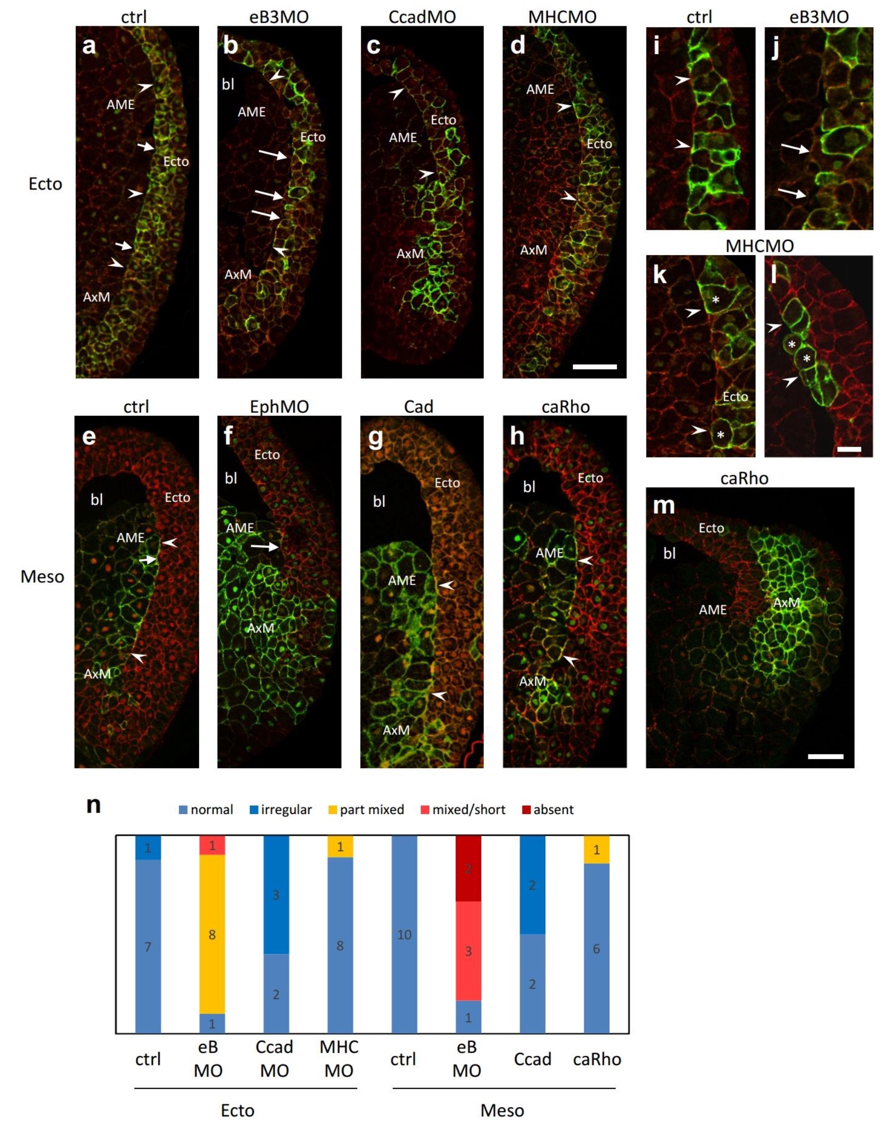 Supplementary Figure 5 | Effect of targeted manipulations on the endogenous ectoderm- mesoderm boundary. Animal or dorsal-equatorial injections at the 4 to 8-cell stage allowed to preferentially target either the ectoderm or the mesoderm, respectively. Injected cells were marked by expression of membrane-targeted GFP. Sagittal cryosections from gastrula embryos were immunostained for GFP and β-catenin, used to visualize cell outlines and analyze the morphology of the boundary. Note that this analysis is less unambiguous than the explant-based assay, because the appearance of the boundary requires normal gastrulation movements, in particular mesoderm involution. Thus a boundary phenotype may not necessarily be due to inhibition of the process of separation per se, but to other gastrulation defects. Interfering with adhesion or myosin activity are likely conditions that may have such global effects. This is also the reason why we routinely perform the explant separation assay using mesoderm from the early gastrula dorsal lip, i.e. just before the start of involution, thus insuring that the exact same region is tested, irrespective of potential later defects in mesoderm migration. (a-h) Representative examples. Arrowheads point to the boundary. Arrows point to boundary irregularities/defects. The normal boundary is never perfectly smooth, but displays sparse indents (a,e, arrows), consistent with temporary phases of reattachment during the cycles of ephrin- Eph-dependent repulsion. Ephrin/Eph depletion led to boundary defects that ranged from partial mixing (b) to its complete absence (f). Dampening adhesive differences either by cadherin depletion in the ectoderm or its overexpression in the mesoderm had little effect on the boundary (c,g). Likewise, the boundary would still form in embryos with myosin depleted-ectoderm or with caRho-expressing mesoderm (d,h). The only instances where cadherin or myosin manipulations appeared to impact on the boundary were those where both ectoderm and mesoderm tissues had been simultaneously targeted, indicating that these defects were not related to DAH/DITH. Panel c shows an example where the upper part of the boundary is intact and corresponds to a region where GFP, marker for cadherin MO injection, is mostly found in the ectoderm, while in the lower part both ectoderm and mesoderm have received cadherin MO, and the boundary is completely absent. (i-l) Details of boundaries. Asterisks in k and l mark cells with different degrees of rounded shape reflecting loss of cell-cell adhesion. (m) Example of caRho-expressing embryo with severe gastrulation defects. caRho-expressing mesoderm has failed altogether to involute. Ecto, ectoderm; AME, anterior mesendoderm; AxM, axial mesoderm; bl, blastocoel. (n) Summary of boundary phenotypes, scored in categories of increasing severity. Partially mixed (part mixed) indicates that portions of the boundary were lost while others appeared intact (e.g. panel b). Numbers of embryos are indicated in the columns. Embryos in which both tissues had GFP signal and embryos showing obvious involution defects as in panel m were not included. |