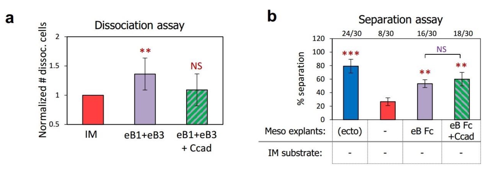 Supplementary Figure 9 | Combined effects of cadherin expression and ephrin signaling. (a) Dissociation assay showing decreased cell-cell adhesion for mesoderm explants upon ephrin ectopic expression and rescue by C-cadherin coexpression. Results are average from eight independent experiments. (b) Separation of mesoderm tissues induced by treatment of the explants with soluble ephrin-Fc is not sensitive to C-cadherin overexpression. Numbers on top correspond to separated/total number of explants, from three experiments. Studentâs t-test, color code as above. |