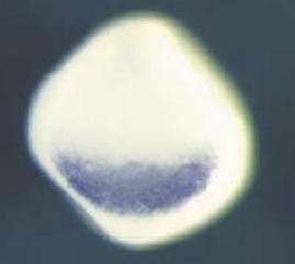 otop3 ( otopetrin 3) gene expression in Xenopus laevis embryo, assayed via in situ hybridization, NF stage 16, anterior view, dorsal up. |
