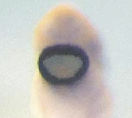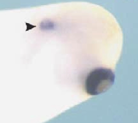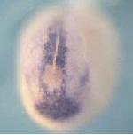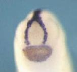 gene expression in Xenopus laevis embryo, assayed via in situ hybridization, NF stage 22, anterior view, dorsal up. |