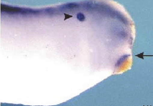 gene expression in Xenopus laevis embryo, assayed via in situ hybridization, NF stage 25, anterior view, dorsal up. |