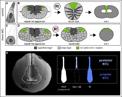 Fig. 7. Hypothetical model ofhmmr functionduring anterior neural tube closure. (A) Elongated cell with polarized microtubule (MT) cytoskeleton in control embryo. (B) During neural fold apposition, cells of the superficial (dark grey) and deep (light gray) layer interdigitate, pulling lateral cells towards the midline (Davidson and Keller, 1999). Upon neural tube closure, cells finalize radial intercalation (RI) to form a unilayered epithelium which re-establishes a ventricular lumen. Far lateral cell populations (green) are directed towards the midline to establish the roof plate (Davidson and Keller, 1999). During further brain development, the roof plate invaginates forming e.g. the septum, which separates the telencephalic hemispheres. (C) Loss of hmmr disturbs cell elongation and MT polarization. (D) During neural tube closure, RI and, consequently, narrowing of neural tissue fails. After neural tube closure, lateral cell populations remain separated which prevents formation of a functional roof plate. (E) Conspicuous morphological differences are apparent in neural tube closure between forebrain and hindbrain / spinal cord regions. PCP components in general are required along the entire anterior-posterior neural axis (white). PCP proteins mediate RI along the entire neural axis (dark blue), while their function in mediolateral intercalation and convergent extension (MLI / CE) is restricted to the hindbrain and spinal cord level (light blue). Together, the two PCP protein-driven processes MLI / CE and RI bring about posterior neural tube closure and spinal cord morphogenesis. Anterior neural tube closure and forebrain morphogenesis is facilitated by PCP protein-driven RI alone. |