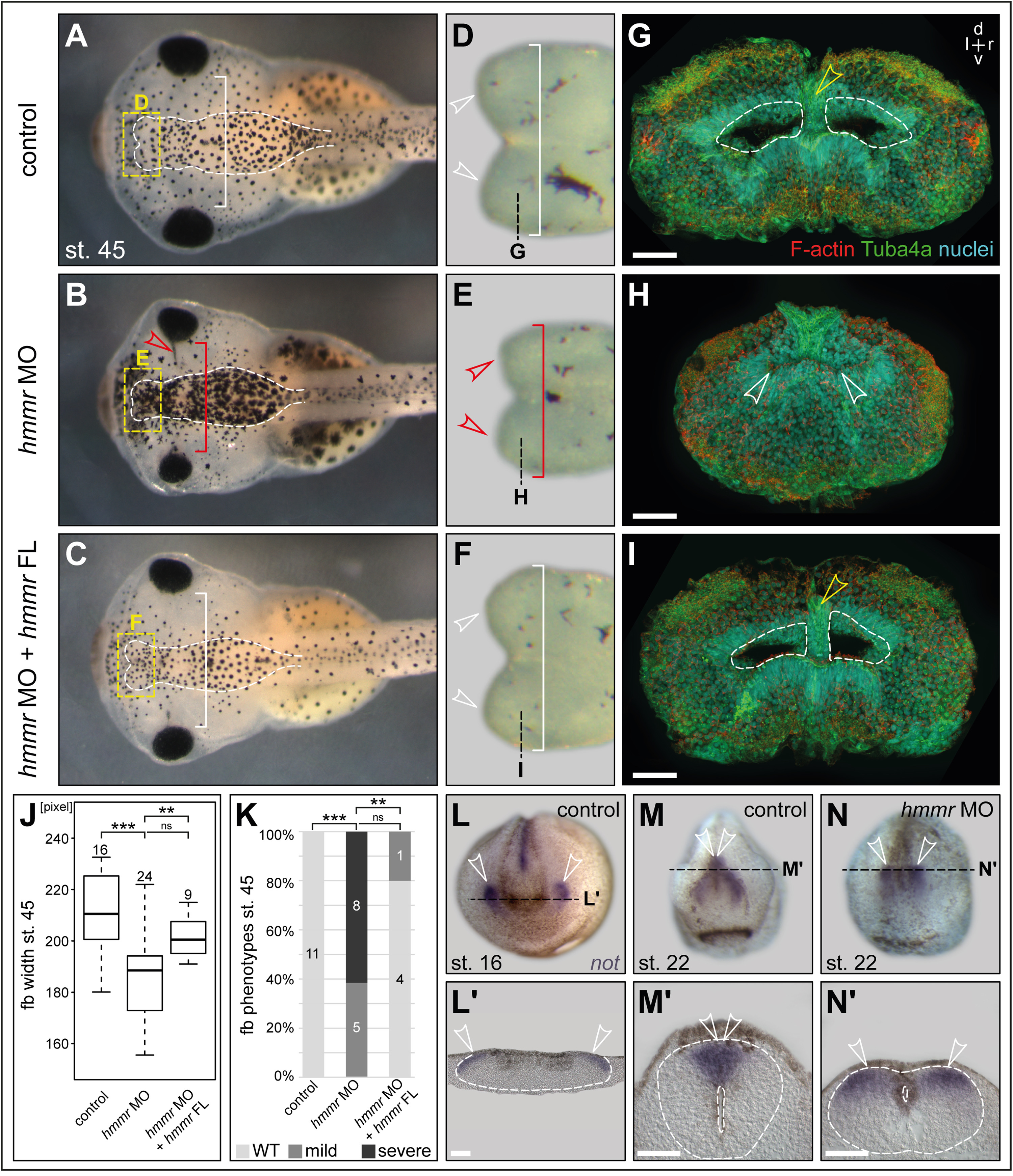 Fig. 1. Disruption of dorsal midline structures inhmmrmorphants. (A-C) Dorsal (d) views of the head region of Xenopus laevis embryos at stage (st.) 45, rostral to the left. Control embryo (A) and embryos injected into both dorsal animal blastomeres at the eight cell stage with hmmr morpholino (MO; B) or hmmr MO together with full length (FL) hmmr (C). Brains outlined in white, white and red brackets indicate wildtype and reduced interocular distance, respectively. Arrowhead in (B) points to pigmented optic stalk. (D-F) Dorsal views of dissected forebrains (fb), brain area indicated by yellow boxes in (A-C); brackets indicate level of fb width measurement, arrowheads point to bilateral olfactory bulbs (OB). Note decrease in OB size and fb width in (E) and restoration of both in (F). (G-I) Fluorescently labeled nuclei and F-actin with immunofluorescence detecting α-tubulin (Tuba4a) reveal morphology of control (G) and treated (H, I) brains transversally bisected at level indicated in (D-F); scale bars: 50 µm. Ventricular lumina outlined in white, yellow arrowheads indicate septum separating hemispheres; note lack of midline separation and absence of lumina in morphant indicated by white arrowheads in (H). Restoration of ventricular lumina and septal structure (I). (J, K) Quantification and statistical analysis of fb width (J) as indicated in (D-F) and fb phenotypes (K). WT: normal lumina / septum, mild: lumina / septum reduced; severe: lumina / septum absent. Number of embryos indicated in each graph. (L-N) not expression in control (L, M) and morphant (N) neurula embryos after whole-mount in situ hybridization (anterior views). Arrowheads indicate medial convergence of bilateral not-expressing cell populations. (Lâ-Nâ) Transverse sections at the forebrain level as indicated in (L-N), neural tissue outlined in white. Note failure of medial convergence in morphant embryos (N, Nâ). Scale bars: 100 µm. l, left; r, right; v, ventral. |