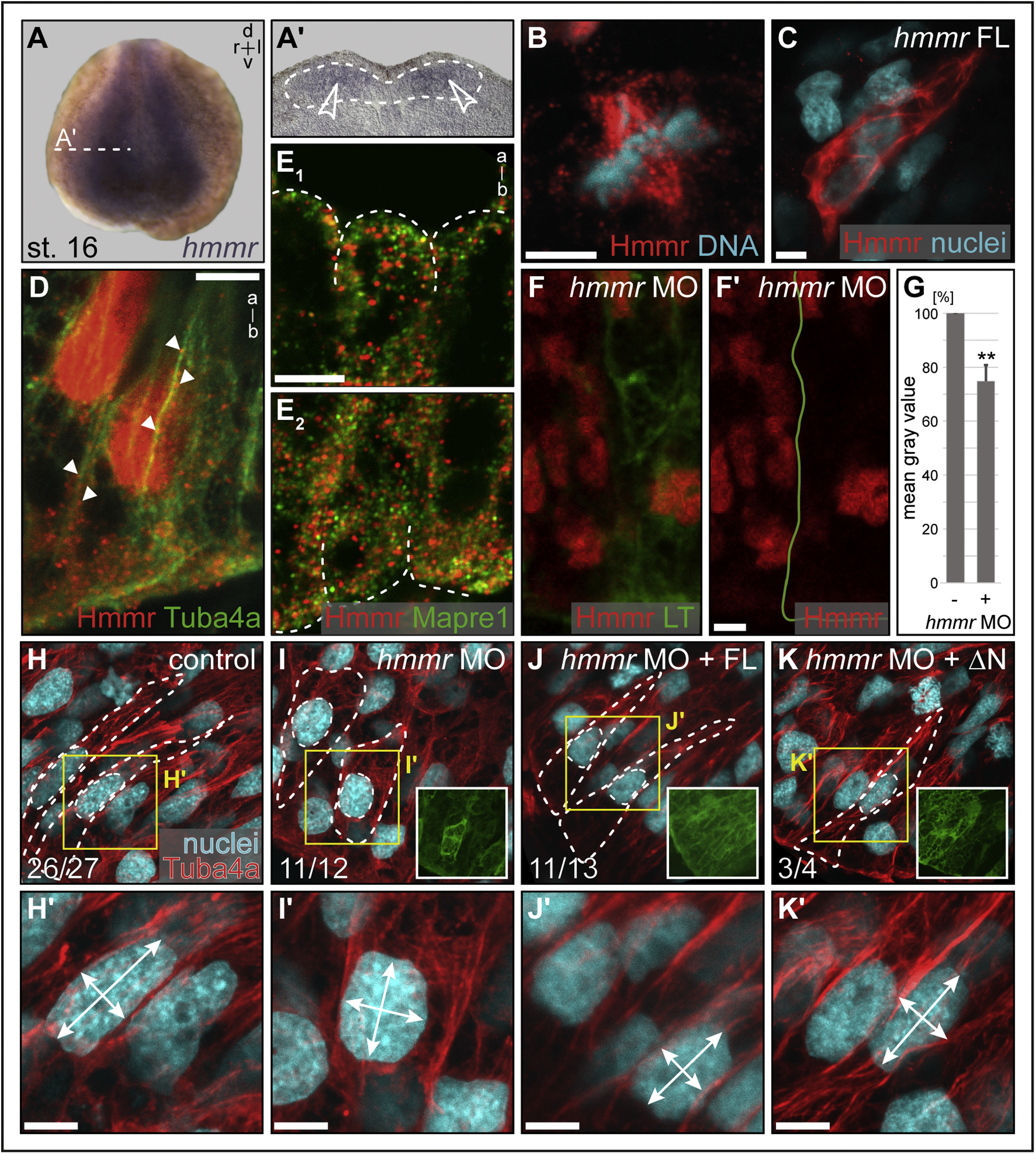 Fig. 4. Microtubule-localized Hmmr determines neural cell polarity. (A) hmmr gene expression in the stage (st.) 16 neural plate. Whole mount in situ hybridization (anterior view). (Aâ²) Transversal histological section as indicated in (A). Arrowheads point to expression in deep neural cells, delineated in white. (B-E) Hmmr protein co-localizes with microtubules (MT) in st. 21 neural cells. (B) Endogenous Hmmr (red) localizes to spindle apparatus in mitotic cells in a dotted pattern. (C) Over-expressed full length Hmmr (hmmr FL; red) localizes with MTs in a pattern typical for over-expressed MAPs. (D) Endogenous Hmmr (red) localizes along MT fibers (arrowheads) and in basal (b) MT lattice detected by anti-Tuba4a antibody (green) as well as to nuclei. (E) Endogenous Hmmr (red) localizes close to MT plus ends apically (a; E1) and basally (E2) as visualized by co-staining for EB1 (Mapre1, green). (F, G) Reduction of Hmmr in hmmr MO-injected cells. Targeted cells identified by lineage tracer (LT) fluorescence (F); LT-positive field of cells indicated by green line in (Fâ). Quantification and statistical analysis of Hmmr fluorescence, n= eight embryos (G). (H-K, Hâ-Kâ) Loss of neural cell polarity in hmmr morphants is rescued by co-expression of FL mRNA. Comparison of cell shape (indicated with white dashed lines) and MT organization (Tuba4a, red) in wildtype (H, Hâ), morphant (I, Iâ), hmmr FL (J, Jâ) and hmmr δN (K, Kâ) rescued specimens; frequency of phenotypes indicated in each panel. Insets in (I-K) demonstrate LT fluorescence in respective area. Arrows in (Hâ-Kâ) indicate elogation / rounding of nuclei. Scale bars: 5 µm. d, dorsal; l, left; r, right, v, ventral. |