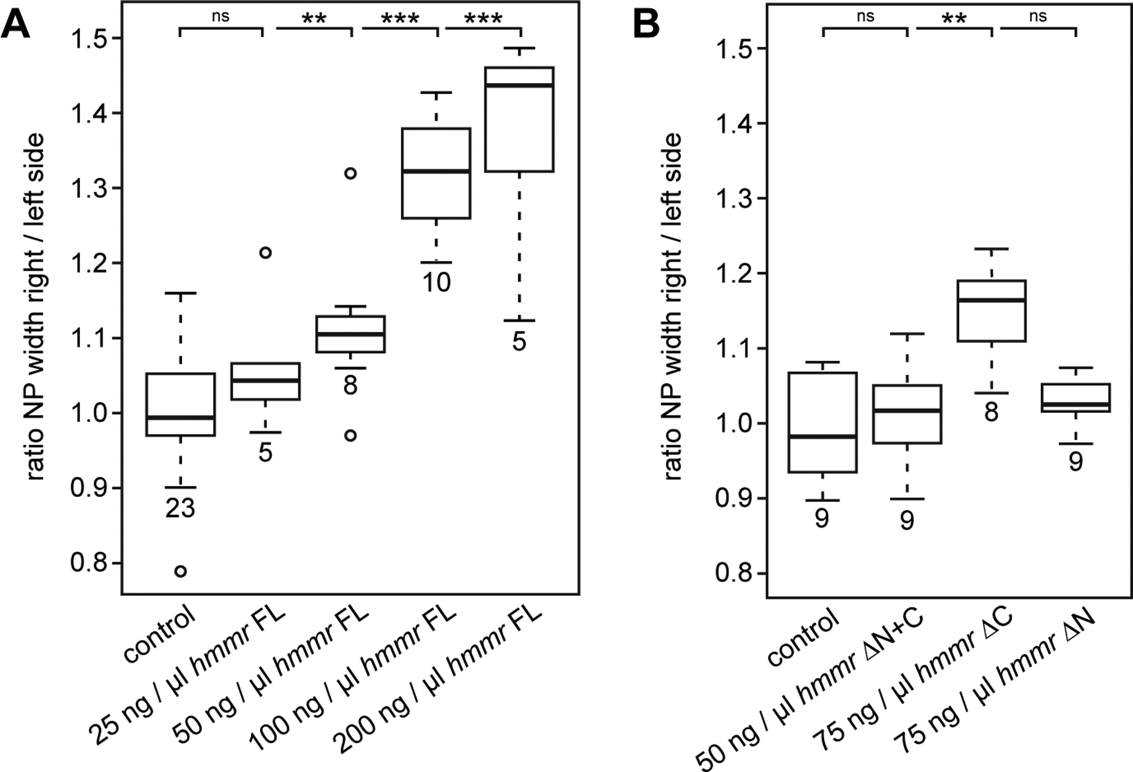 Fig. S3. Ectopic expression ofhmmrconstructs harboring the microtubule binding domains causes failure of neural plate narrowing. Statistical analysis of neural tissue width in control embryos and embryos injected at the eight cell stage into the right dorsal animal blastomere with increasing concentrations of full length (FL) hmmr (A) or hmmr deletion constructs as indicated (B). ns, not significant; number of embryos analyzed indicated for each plot. |