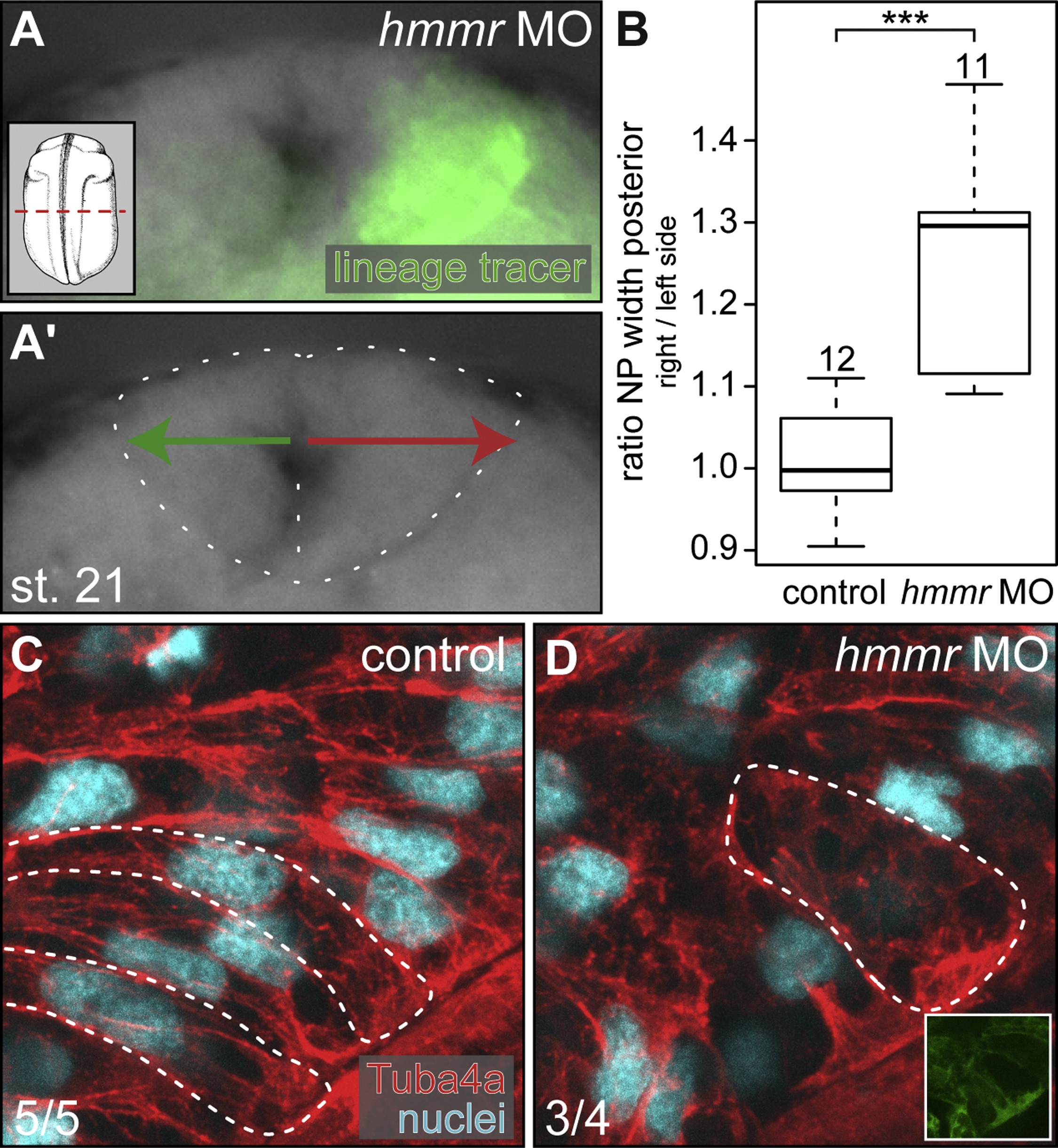 Fig. S4. Posterior neural tube morphogenesis inhmmrmorphants. (A, Aâ) Embryo injected unilaterally with hmmr morpholino (MO) into the right dorsal animal blastomere at the eight cell stage (st.) and bisected transversally through the posterior neural plate at st. 21 as indicated in inset. View onto cut surface, lineage tracer (LT) fluorescence marks targeted tissue (A). Dashed white lines mark border of neural tissue and indicate midline (Aâ). Wildtype (WT) and widened neural tissue indicated by green and red arrow, respectively. (B) Statistical analysis of neural tissue width in control and treated embryos, number of embryos indicated for each plot. (C, D) Comparison of cell shape (indicated by white dashed lines) and microtubule organization (Tuba4a, red) in WT (C) and morphant (D). Frequency of phenotypes indicated in each panel; inset shows LT fluorescence in the respective area. |