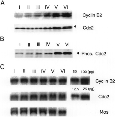 Fig. 1. Expression of Cyclin B2 and Cdc2, and pre-MPF formation during oogenesis. (A) Western blotting analysis of Cyclin B2 and Cdc2. Oocyte extracts prepared from the smallest stage I oocytes to stage VI oocytes were subjected to Western blotting analysis with anti-PSTAIR (Furuno et al., 1994) or anti-Cyclin B2 antibody (Yoshitome et al., 1998), respectively. Routinely, oocyte extracts equivalent to one half of a stage VI oocyte were used in this assay. I, II, III, IV, V and VI indicate stages I, II, III, IV, V and VI, respectively. Since the size of each stage varied widely, we chose the oocytes according to the following criteria: oocytes of stages I, II, III, IV, V and VI were about 50 μm in diameter and transparent, about 300 μm and translucent, about 500 μm and light brown, of minimum size with differentiated animal and vegetal hemispheres, about 1000 μm without a white band and 1200 μm with a white band, respectively. Cyclin B2 was detected in two forms, as previously reported in stage VI oocytes. The band indicated by a filled triangle corresponds with the phosphorylated form of Cdc2 on Thr14 and Tyr15, whose residues become phosphorylated when Cdc2 associates with Cyclin B (Solomon et al., 1990). (B) Pre-MPF formation during oogenesis. Extracts of oocytes from each stage were subjected to Western blotting with Anti-phospho-Tyr (Cdc2) (purchased from Cell Signal Technology). The phosphorylated form of Cdc2 is indicated by a filled triangle. (C) Northern blotting analysis of Cyclin B2 and Cdc2. Total RNA was extracted from 100 oocytes of stages I and II, 20 oocytes of stage III and 10 oocytes of stages IV to VI. Total RNA equivalent to that of two and a half oocytes prepared from oocytes of each stage was subjected to Northern blotting using Cdc2 or Cyclin B2 cDNA as the probe. Usually, total RNA of the same number of oocytes of the same stages is used for Northern blotting analysis or RNase protection assays (Sagata et al., 1988, Kobayashi et al., 1991, Paris et al., 1991), because the amount of rRNA is greatly increased during oogenesis. Mos mRNA was used for the loading control. The amount of this mRNA is reported to remain fairly constant during oogenesis (Sagata et al., 1988). Pure Cyclin B2 or Cdc2 mRNA transcribed in vitro was used as a standard for estimating the mRNA concentration. |