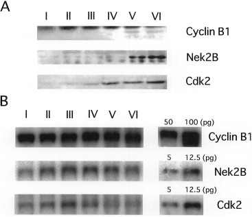 Fig. 4. Expression of Cdk2, Nek2B and Cyclin B1 during oogenesis. (A) Western blotting analysis of Cdk2, Nek2B and Cyclin B1. Western blotting was performed with anti-Cyclin B1 (Yoshitome et al., 1998), Nek2B (Uto et al., 1999) or Cdk2 antibody (Furuno et al., 1997), respectively. (B) Northern blotting analysis of Cdk2, Nek2B and Cyclin B1. Total RNA extraction and Northern blotting were performed as described in Fig. 1. Each mRNA was probed by using Cyclin B1, Nek2B or Cdk2 cDNA. Pure Cyclin B1, Nek2B or Cdk2 mRNA made in vitro was used as a standard for estimating the mRNA concentration.