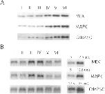 Fig. 3. Expression of positive regulators of MPF during oogenesis. (A) Western blotting analysis of Cdc25C, MEK and MAPK. Western blotting was carried out with anti-XeCdc25C (Nakajo et al., 1999), MEK (purchased from Santa Cruz) or MAPK antibody (purchased from Santa Cruz), respectively. (B) Northern blotting analysis of Cdc25C, MEK and MAPK. The mRNA of Cdc25C, MEK and MAPK was detected by using Cdc25C, MEK or MAPK cDNA as the probe. Pure MEK, MAPK or Cdc25C mRNA transcribed in vitro was used as a standard for estimating the mRNA concentration. |