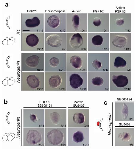 Figure 4. Nodal/Activin is the main signal triggering neural induction.a, Expression of K1 and Neurogenin in control, dorsomorphin-treated, Activin-treated, FGF1/2-treated or Activin+FGF1/2-treated GE and BE. b, Expression of Neurogenin in FGF1/2+SB505124-treated and Activin+SU5402-treated GE and BE. c, Neurogenin expression induction by the graft of the dorsal blastoporal lip on GE is lost after SB505124 treatment in most cases, but maintained after SU5402 treatment. Number of explants showing the presented expression pattern is indicated on each panel. Scale bar, 50 µm. |