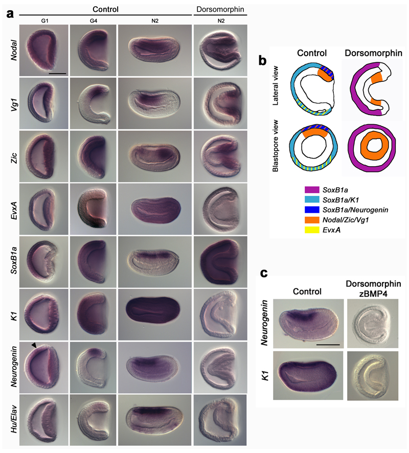 Figure 2. Role of BMP in ectodermal cell fate commitment.a, Expression of Nodal, Vg1, Zic, EvxA, SoxB1a, K1, Neurogenin and Hu/Elav in G1, G4 and N2 stage control embryos and in dorsomorphin-treated N2 stage embryos. The white arrow head indicates the early ectodermal Neurogenin expression domain in control embryos. b, Schematic partial representation of the results presented in (a). c, Expression of K1 and Neurogenin at the N2 stage in control embryos and embryos treated with both dorsomorphin and zBMP4. All in situ hybridization images are side views with anterior towards the left. Scale bar, 50 µm. |