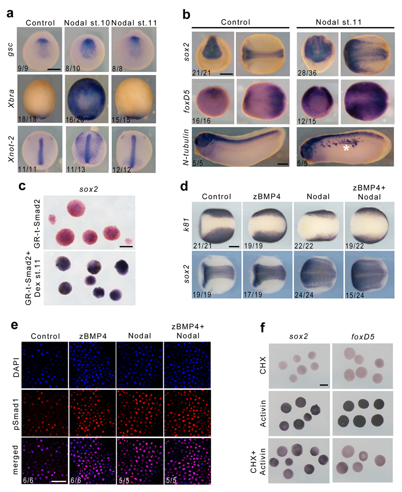 e, Confocal images of pSmad1 immunostaining and nuclear DAPI staining in control embryos and in embryos injected with zBMP4, Nodal or both recombinant proteins. Scale bar, 50 µm.