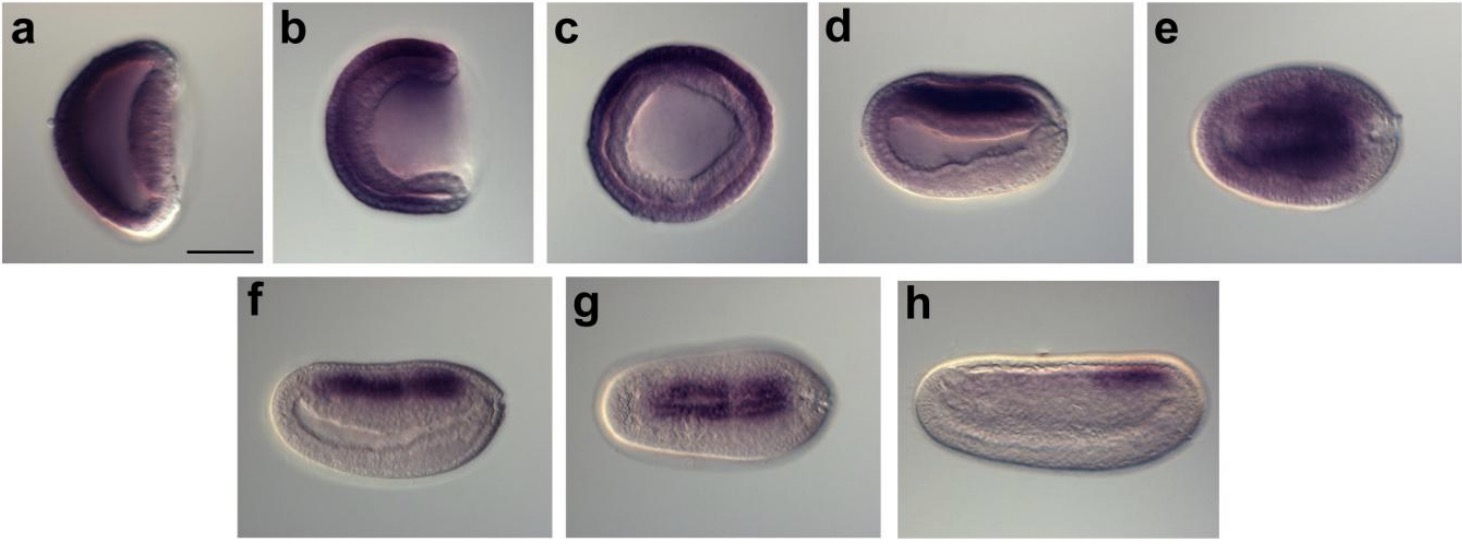 Supplementary Figure 2. SoxB1a expression pattern. In situ hybridization at different developmental stages. (a), (b), (d), (f) and (h) are side views. (c) is a blastoporal view of the embryo shown in (b). (e) and (g) are dorsal views of the embryos shown in (d) and (f), respectively. Scale bar, 50µm. |