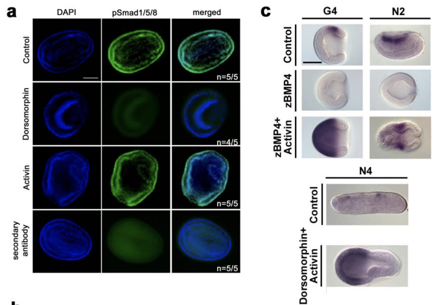 a, Immunostaining against pSmad1/5/8 and nuclear DAPI staining in control, dorsomorphintreated and Activin-treated N2 stage amphioxus embryos.