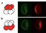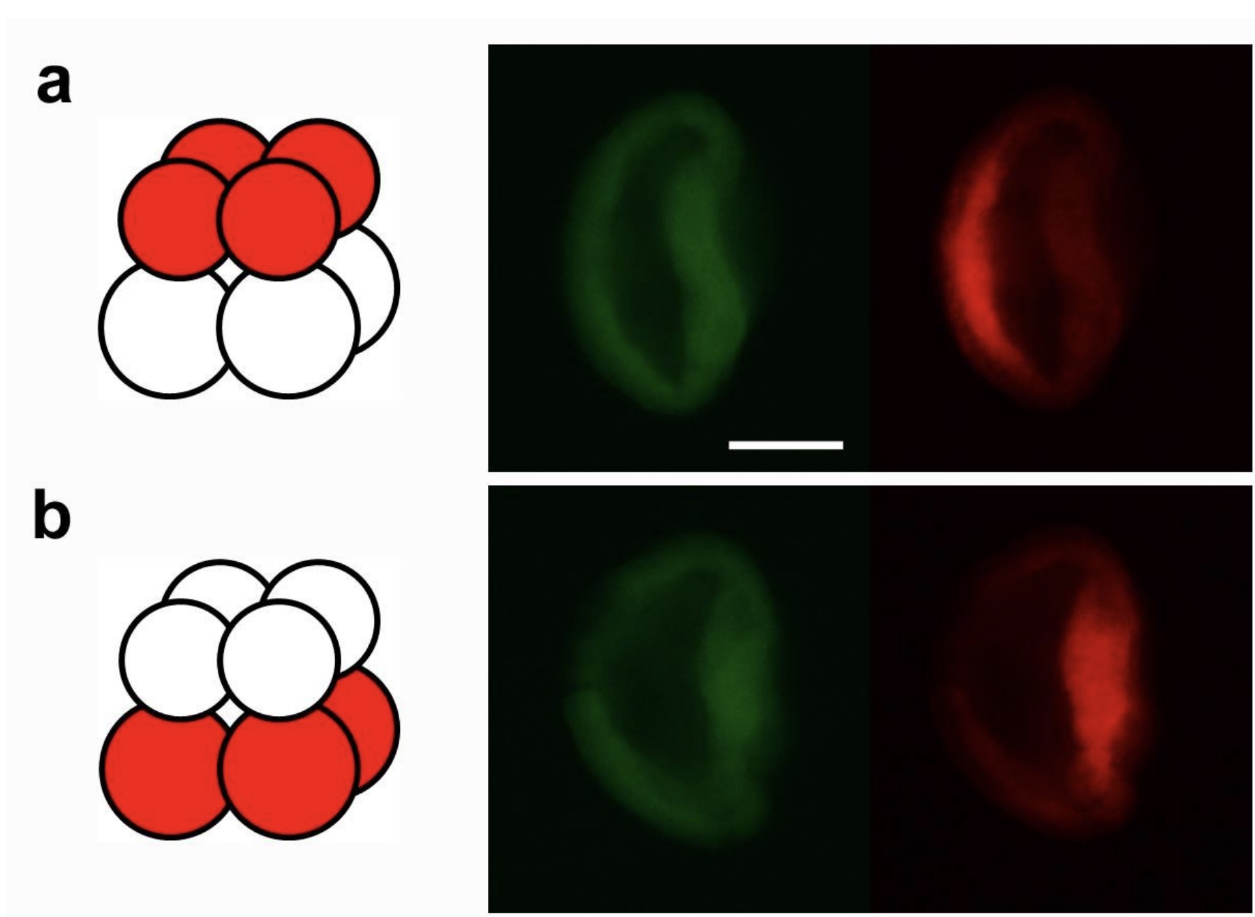 observed in the ectoderm in embryos in which animal cells were labeled (a) whereas red fluorescence is observed in the mesendoderm when vegetal cells were labeled (b). Scale bar,