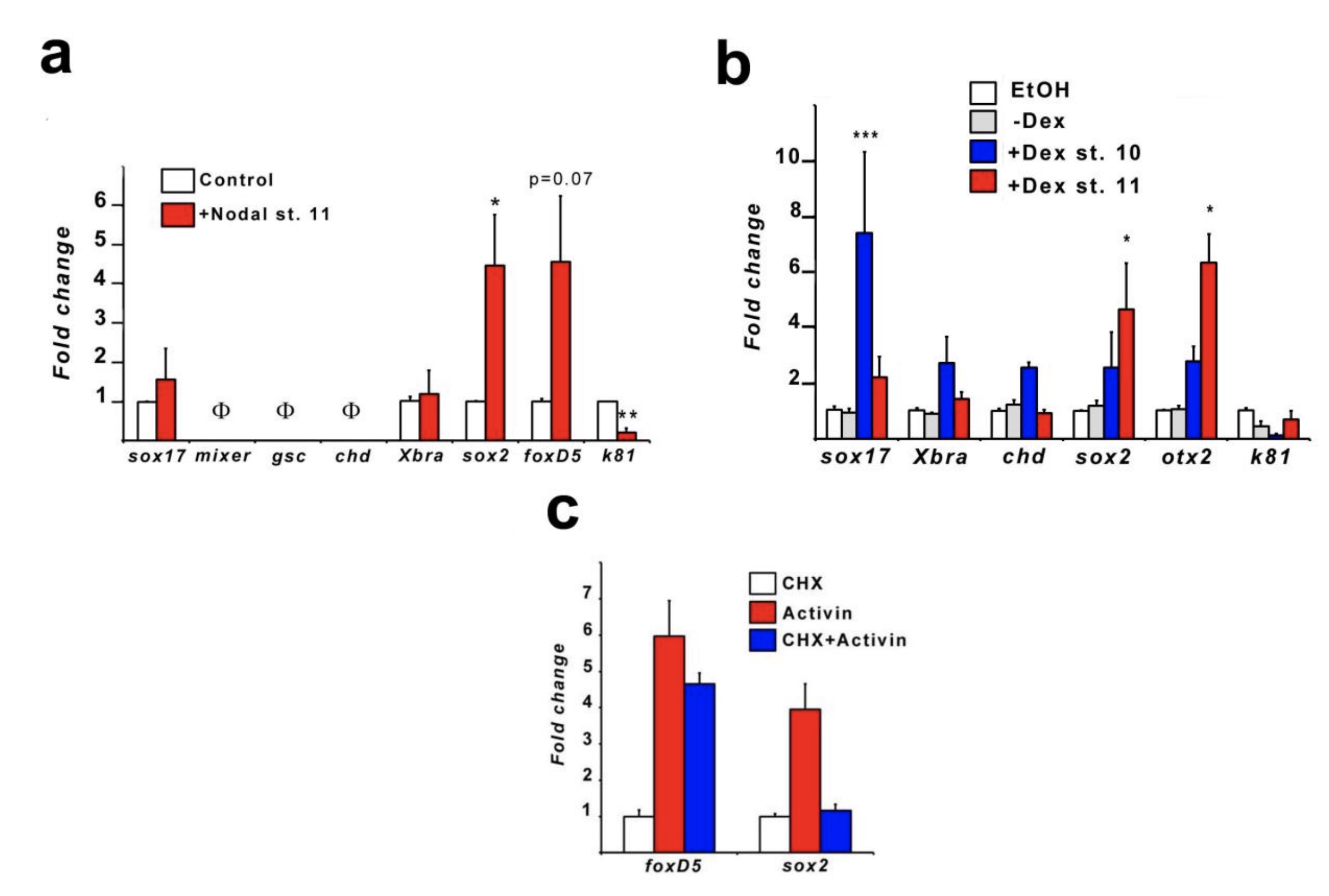 assays. a, RT-qPCR from animal caps treated from stage 11 to 15 with Nodal. Bars represent SEM of 5 independent experiments, ïï represents undetectable (background) gene expression levels. Statistical analysis has been performed using Paired t-test, * p<0.05; ** p<0.005. b, RT-qPCR from animal caps injected with GR-t-Smad2, explanted at early gastrula stage and induced or not with dexamethasone at stage 10 or 11. Uninjected animal caps were treated with ethanol and served as reference. Bars represent SEM of 4 independent experiments, except for chd and otx2 for which they represent 2 independent experiments. Statistical analysis has been performed using Two-way ANOVA followed by Bonferroni post-test; *