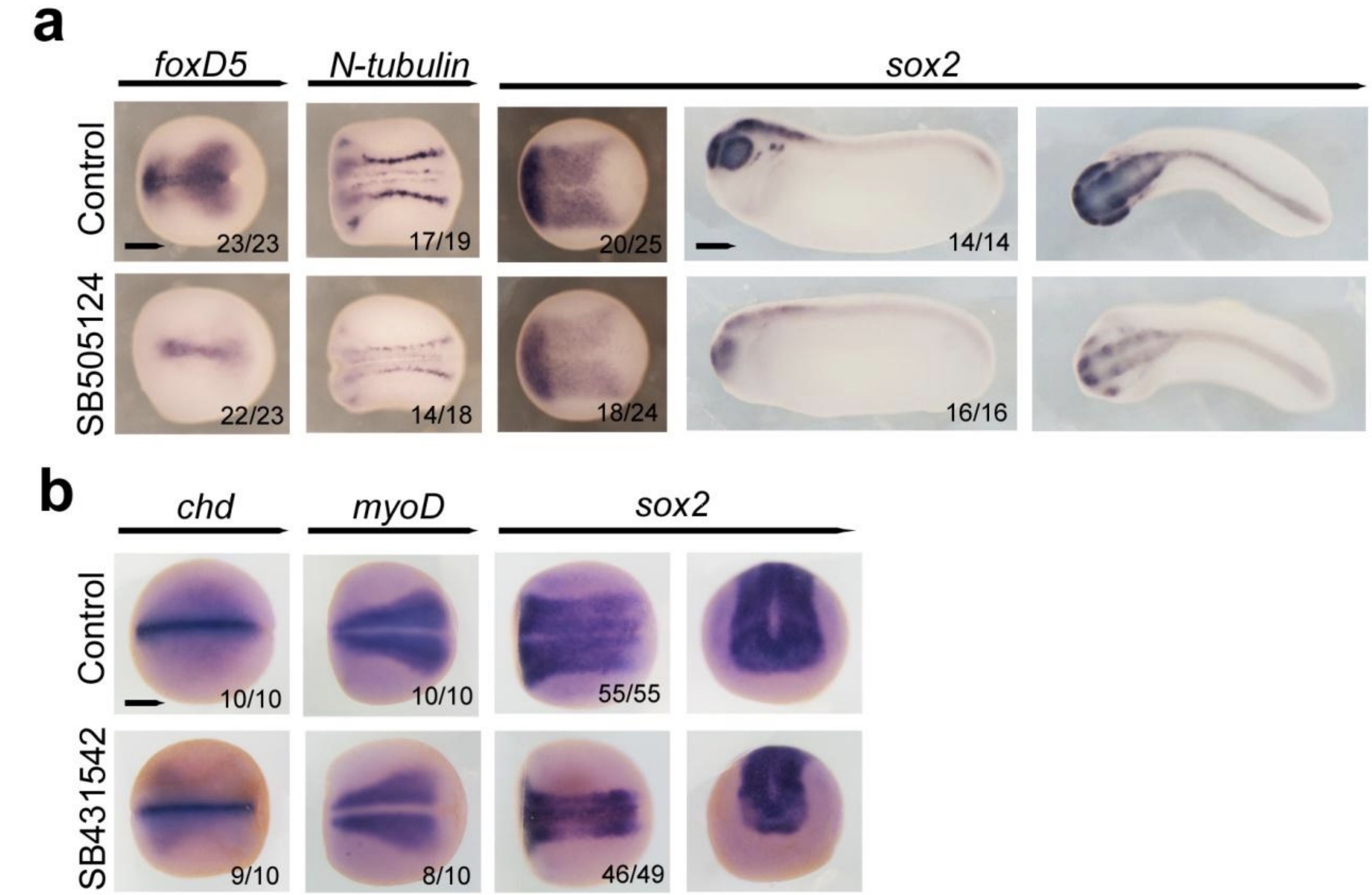 Supplementary Figure 8. Activin/Nodal signaling is required for proper neural tissue formation in Xenopus. a, Expression of foxD5 at stage 13, N-tubulin at stage 15 and sox2 at stage 13 (left) and stage 25 (right) in control embryos and in embryos treated with 200µM SB505124 from midgastrula stage 11. Note the decreased intensity of neural marker gene expression in SB505124-treated embryos. Dorsal view for foxD5, N-tubulin and sox2 at stage 13 and stage 25 (right) and lateral view for sox2 at stage 25 (left). b, Expression of chd, myoD and sox2 at early neurula stage 14 in control embryos and in embryos treated with 800µM SB431542 from stage 11. Note the reduced neural plate in SB431542-treated embryos despite normal axial and paraxial mesoderm formation. Dorsal view for chd, myoD and sox2 (left), and anterior view for sox2 (right). Scale bar, 200µm. |