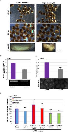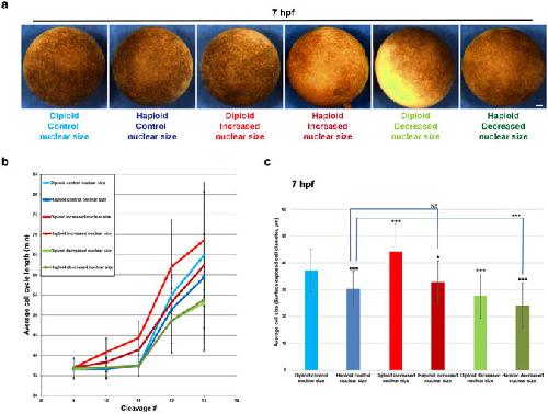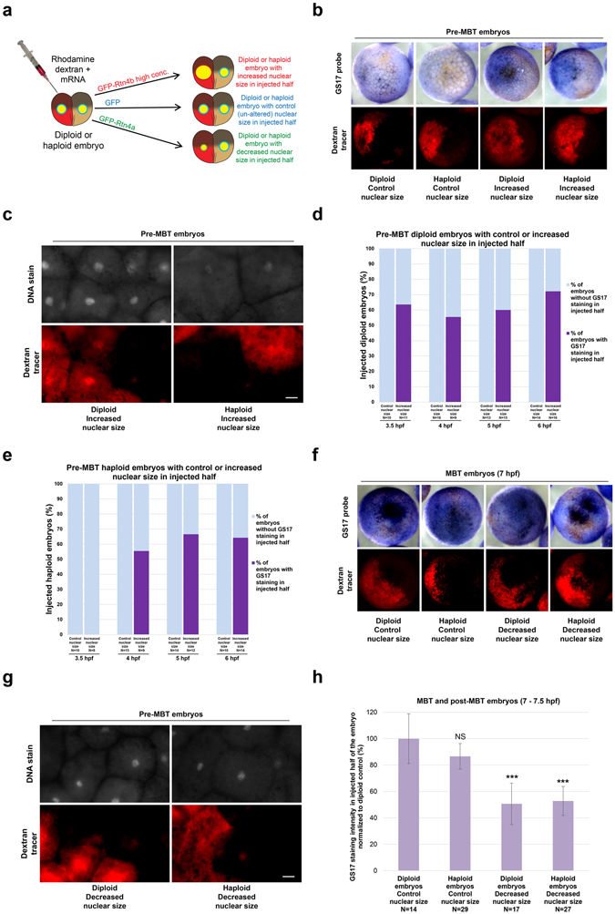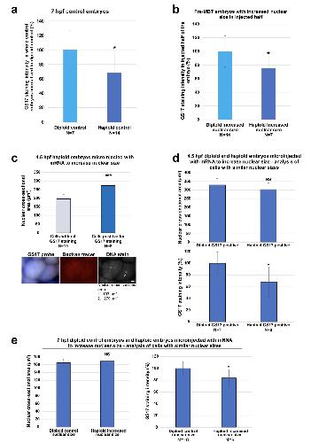 (d) Diploid and haploid embryos were microinjected with mRNA to increase nuclear size. Cells in 4.5 hpf embryos that were positive for GS17 staining and exhibited similar