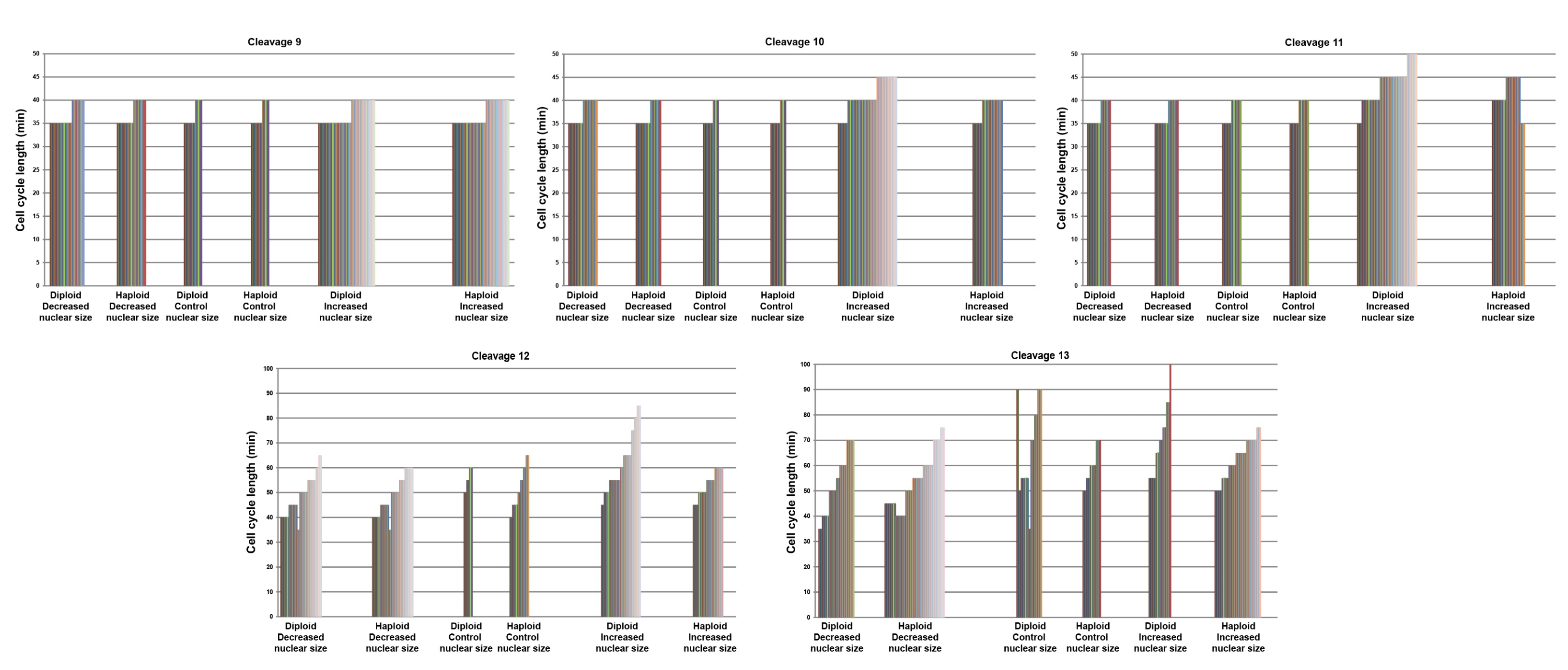 Supplementary Figure 2. Cell cycle timing in embryos with altered nuclear size and ploidy